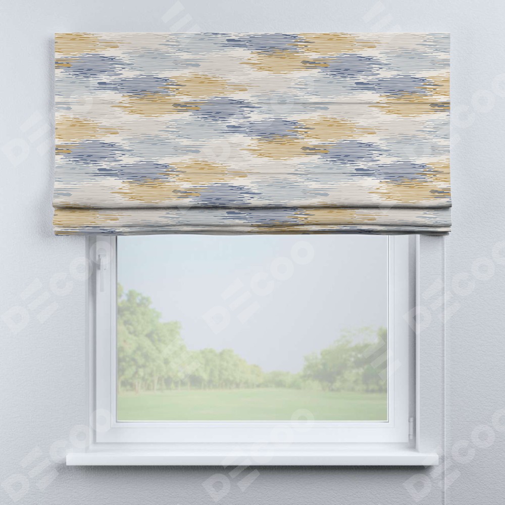 Римская штора производителя «Cortin», используется для проёма, пошита из ткани блэкаут с нанесением сублимационной печати «Полосатая волна». Имеет универсальный механизм и подходит для монтажа: на потолок, на стену и в нишу.