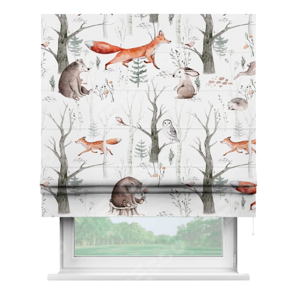 Римская штора производителя «Cortin», используется для проёма, пошита из ткани блэкаут с нанесением сублимационной печати «Лесной питомник». Имеет универсальный механизм и подходит для монтажа: на потолок, на стену и в нишу.