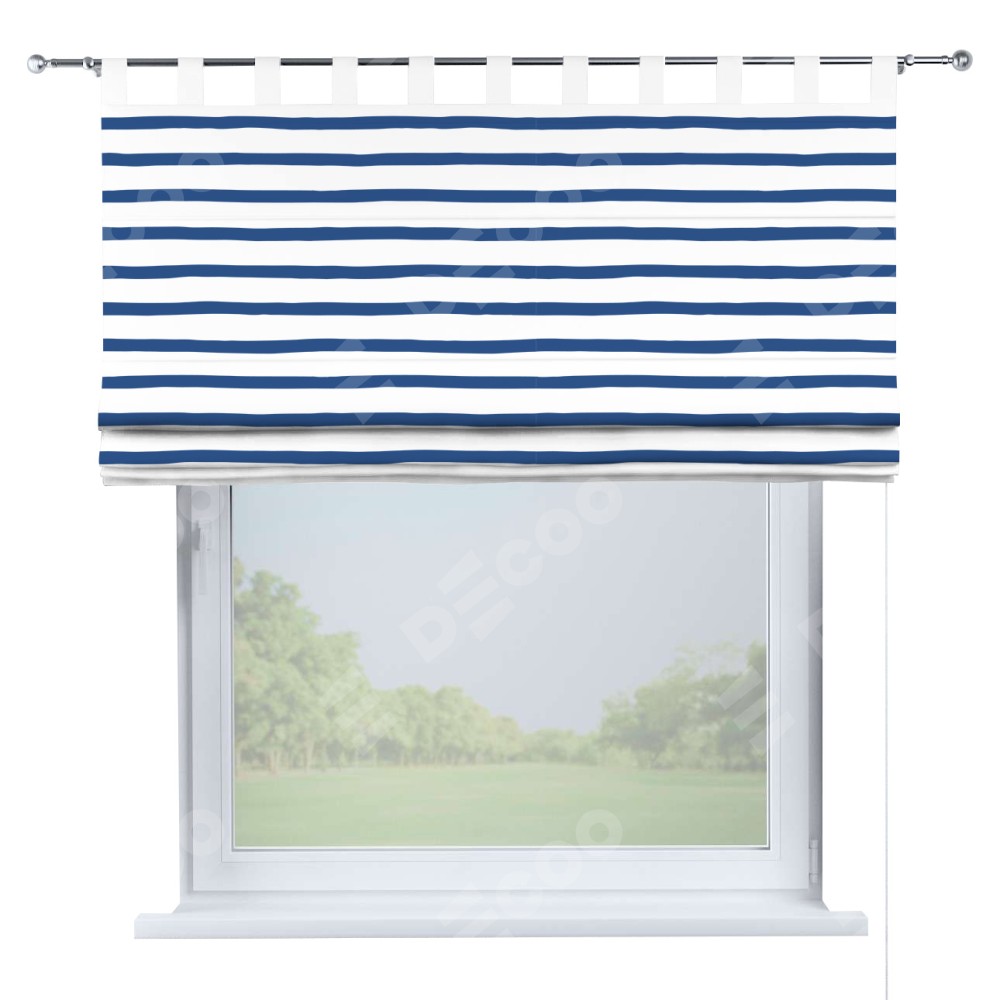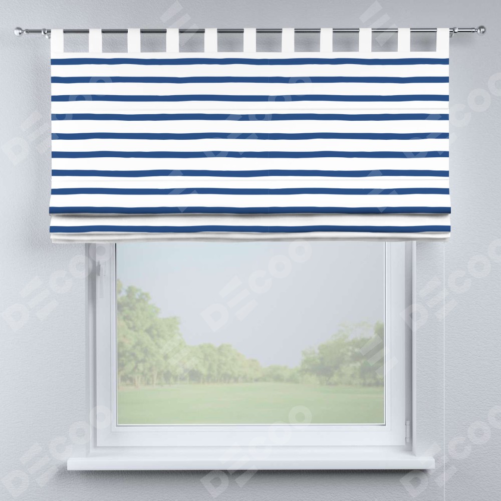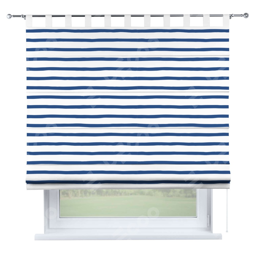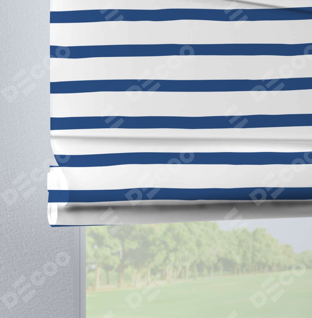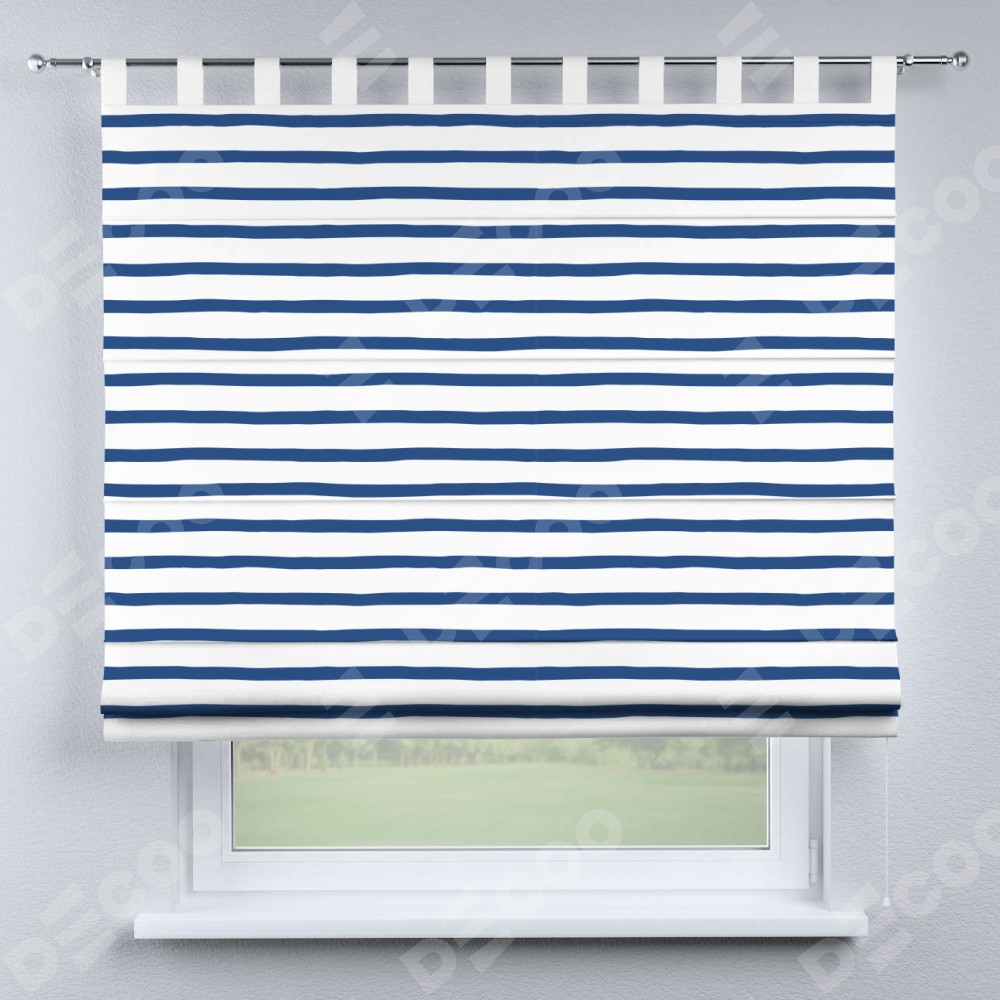 Римская штора производителя «Cortin», используется для проёма, пошита из ткани блэкаут с нанесением сублимационной печати «Морская полоска». Данная модель пошита на петлях, комплектуется на выбор круглым карнизом и подходит для монтажа на стену. Римская штора на петлях имеет простую систему регулировки высоты, отличительным преимуществом данной модели является простой способ монтажа. Достаточно повесить ее на трубу и штора готова!