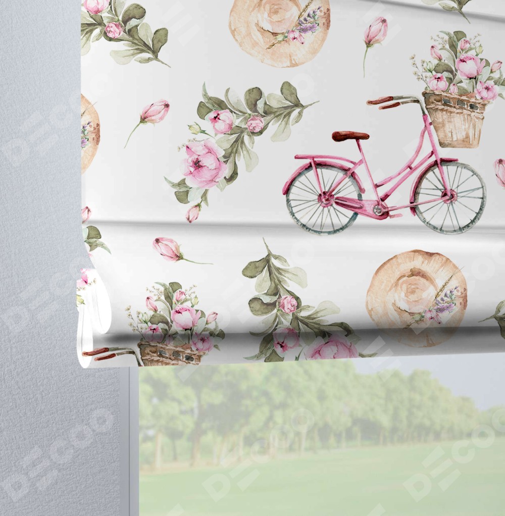 Римская штора производителя «Cortin», используется для проёма, пошита из ткани блэкаут с нанесением сублимационной печати «Розовый велосипед». Данная модель пошита на петлях, комплектуется на выбор круглым карнизом и подходит для монтажа на стену. Римская штора на петлях имеет простую систему регулировки высоты, отличительным преимуществом данной модели является простой способ монтажа. Достаточно повесить ее на трубу и штора готова!