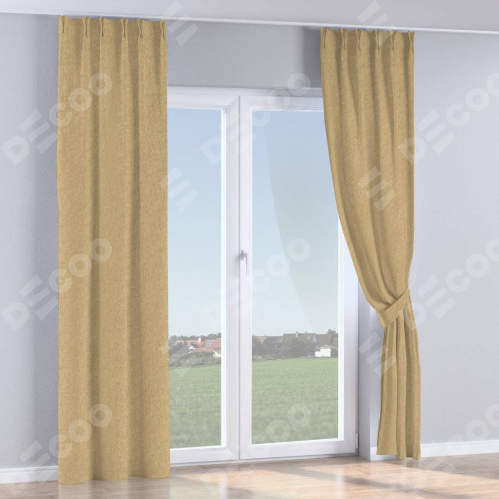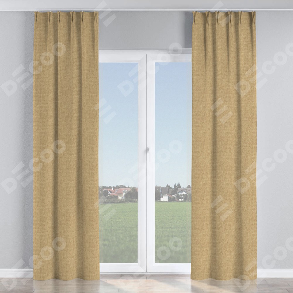 Комплект прямых штор, от производителя «Cortin», пошиты из ткани стиф димаут бежевый, артикул ткани 18083. С изнаночной стороны в верхней части штор пристрачивается шторная лента с декоративными складками «Кустик». Для создания элегантных складок прямые шторы шьются по стандарту с коэффициентом 1:2 (на 100 см. ширины проёма 200 см. ширины ткани).