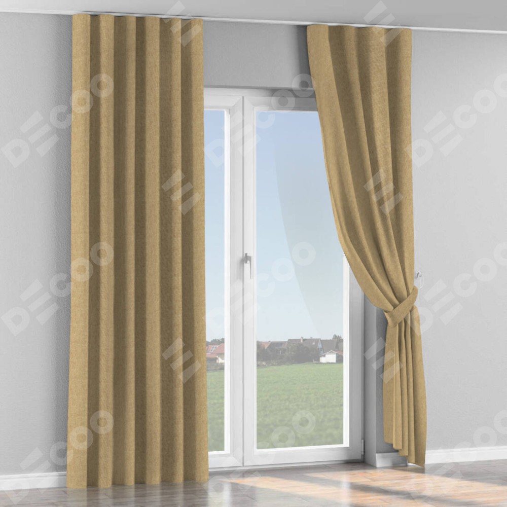 Комплект прямых штор, от производителя «Cortin», пошиты из ткани стиф димаут бежевый, артикул ткани 18083. С изнаночной стороны в верхней части штор пристрачивается шторная лента с декоративными складками «Волна». Для создания элегантных складок прямые шторы шьются по стандарту с коэффициентом 1:2 (на 100 см. ширины проёма 200 см. ширины ткани).