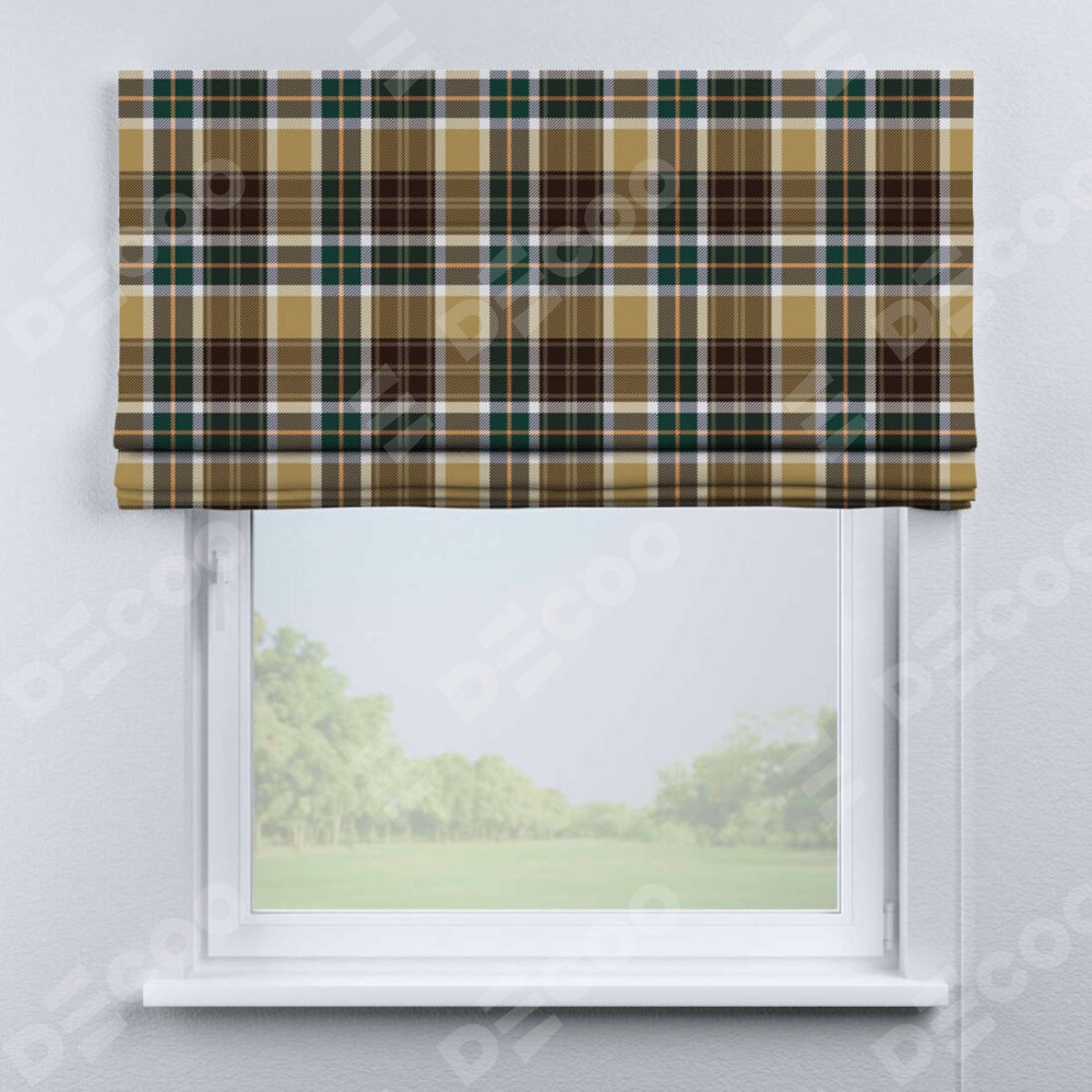 Римская штора производителя «Cortin», используется для проёма, пошита из ткани блэкаут с нанесением сублимационной печати «Бежево-зелёная клетка». Имеет универсальный механизм и подходит для монтажа: на потолок, на стену и в нишу.
