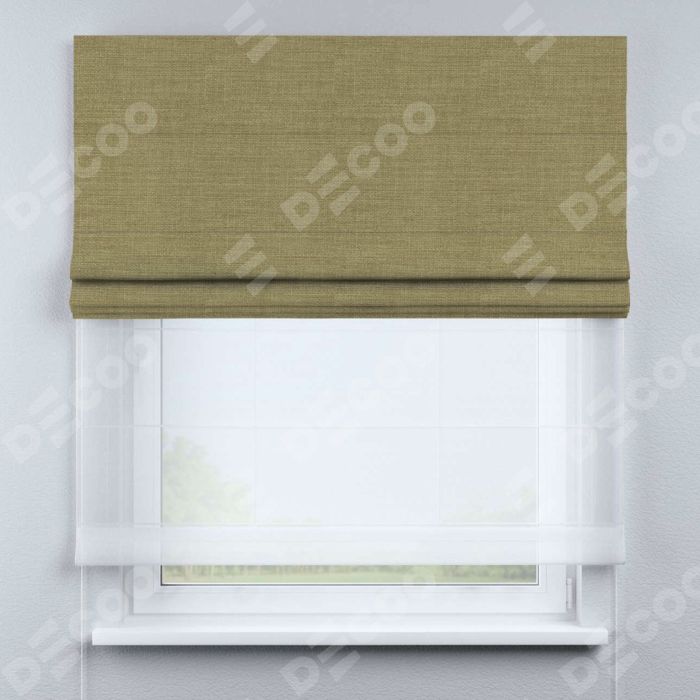 Римская штора день-ночь производителя «Cortin», используется для проёма, пошита из двух полотен, с лицевой стороны лён коричневый артикул 7443, вторая ткань тюль (по стандарту комплектуется тюль белого цвета артикул V-01). Имеет универсальный механизм и подходит для монтажа: на потолок, на стену и в нишу.