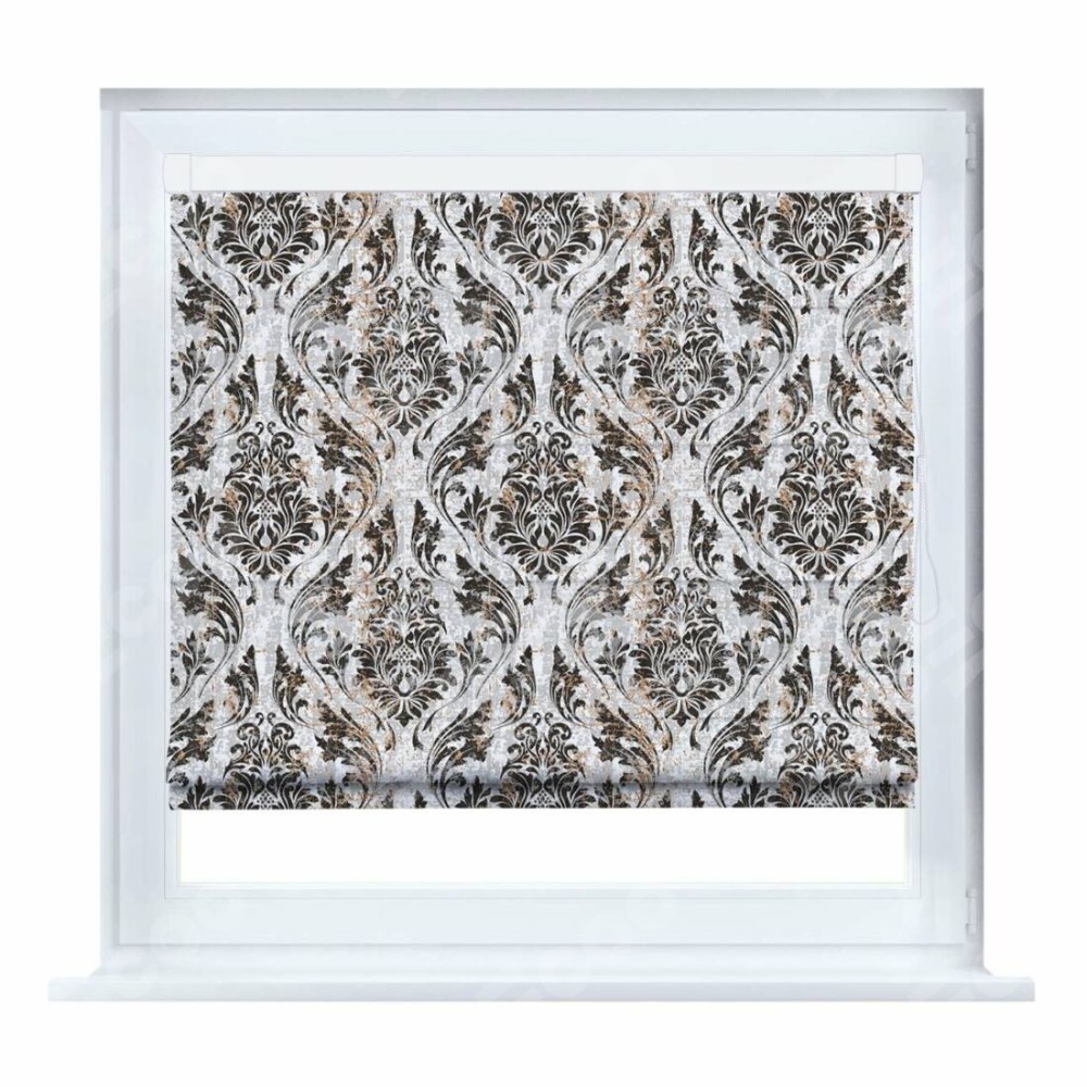 Римская штора производителя «Cortin», устанавливается на створку окна, пошита из ткани блэкаут с нанесением сублимационной печати «Дамаск тёмный». Штора шьётся по индивидуальным размерам, для данного типа римской шторы возможная ширина от 35 до 150 см., высота до 250 см.
