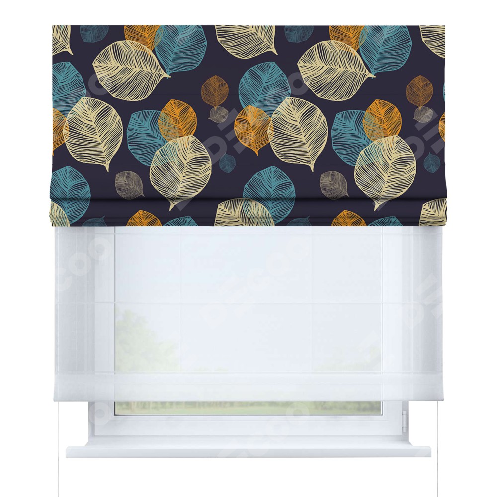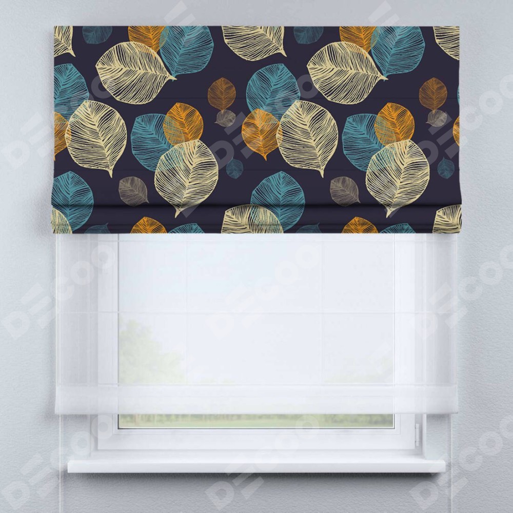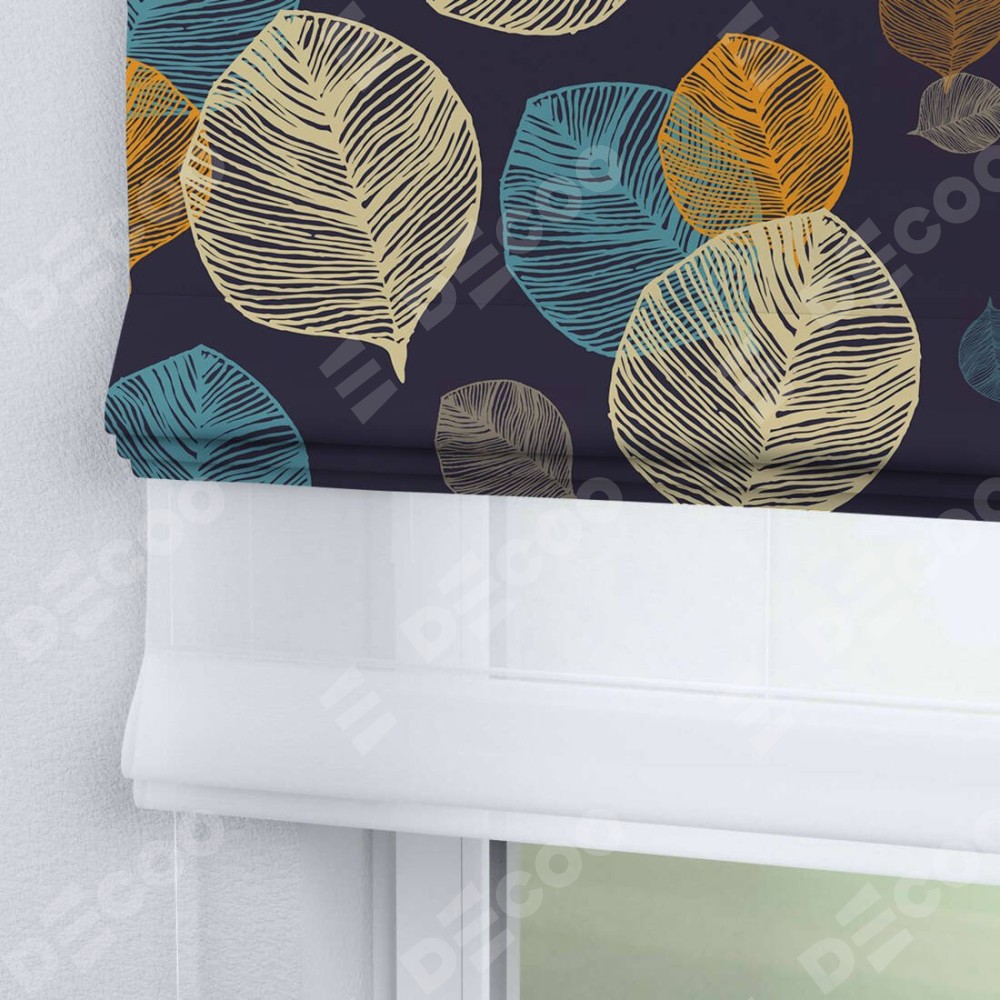 Римская штора день-ночь производителя «Cortin», используется для проёма, пошита из двух полотен, с лицевой блэкаут с нанесением сублимационной печати «Листья в ночи», вторая ткань тюль (по стандарту комплектуется тюль белого цвета артикул V-01). Имеет универсальный механизм и подходит для монтажа: на потолок, на стену и в нишу.