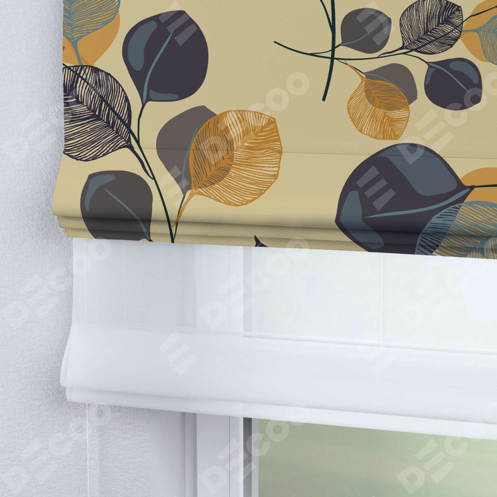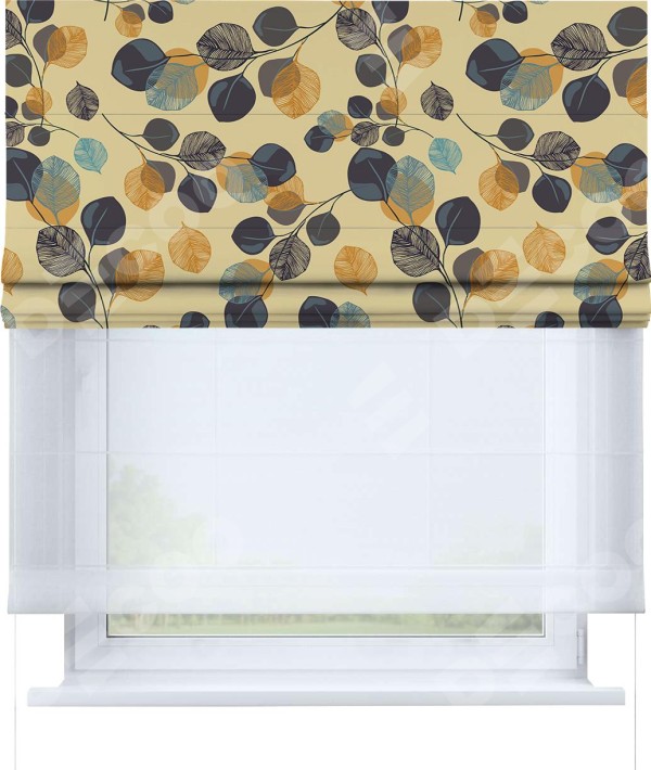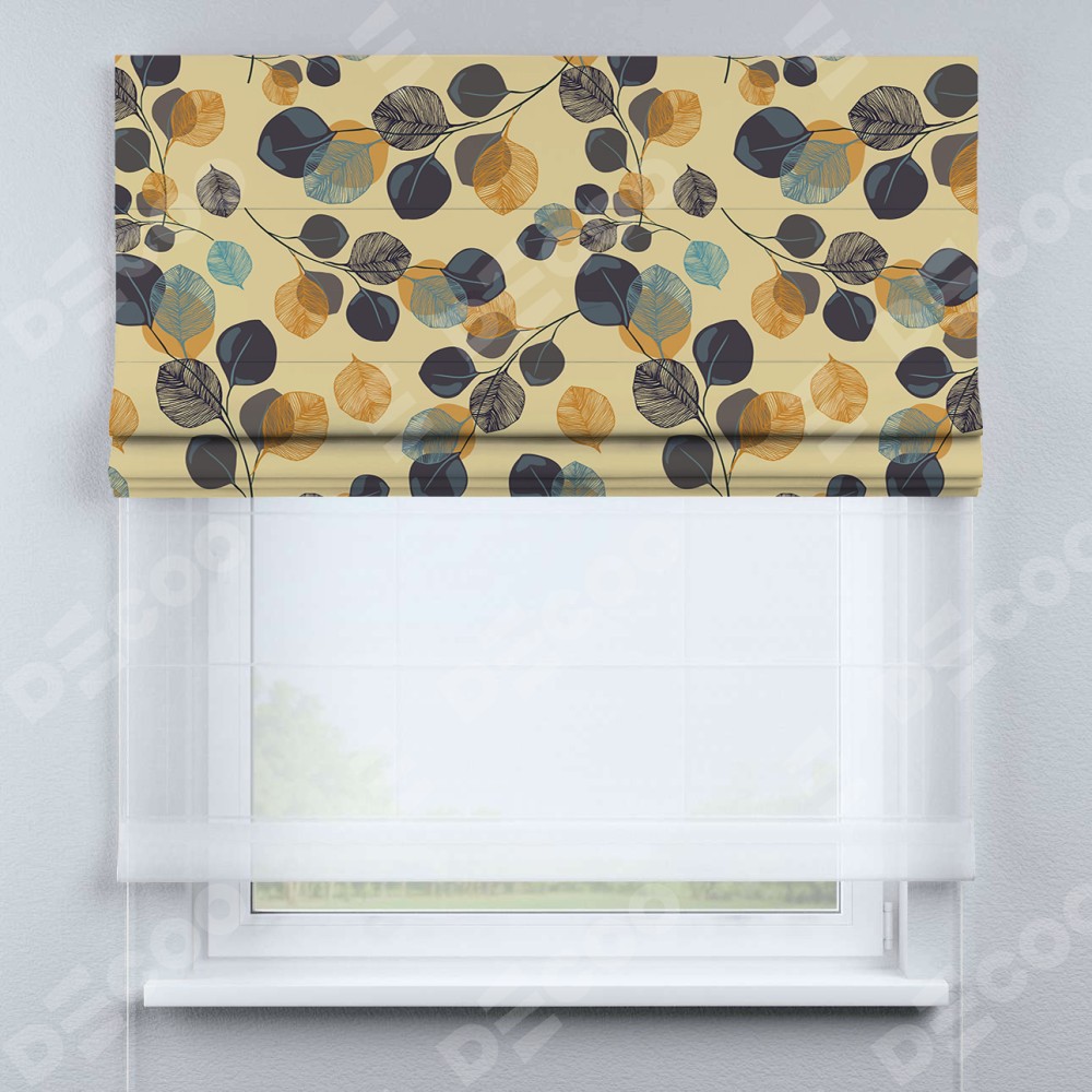 Римская штора день-ночь производителя «Cortin», используется для проёма, пошита из двух полотен, с лицевой блэкаут с нанесением сублимационной печати «Листья в янтаре», вторая ткань тюль (по стандарту комплектуется тюль белого цвета артикул V-01). Имеет универсальный механизм и подходит для монтажа: на потолок, на стену и в нишу.