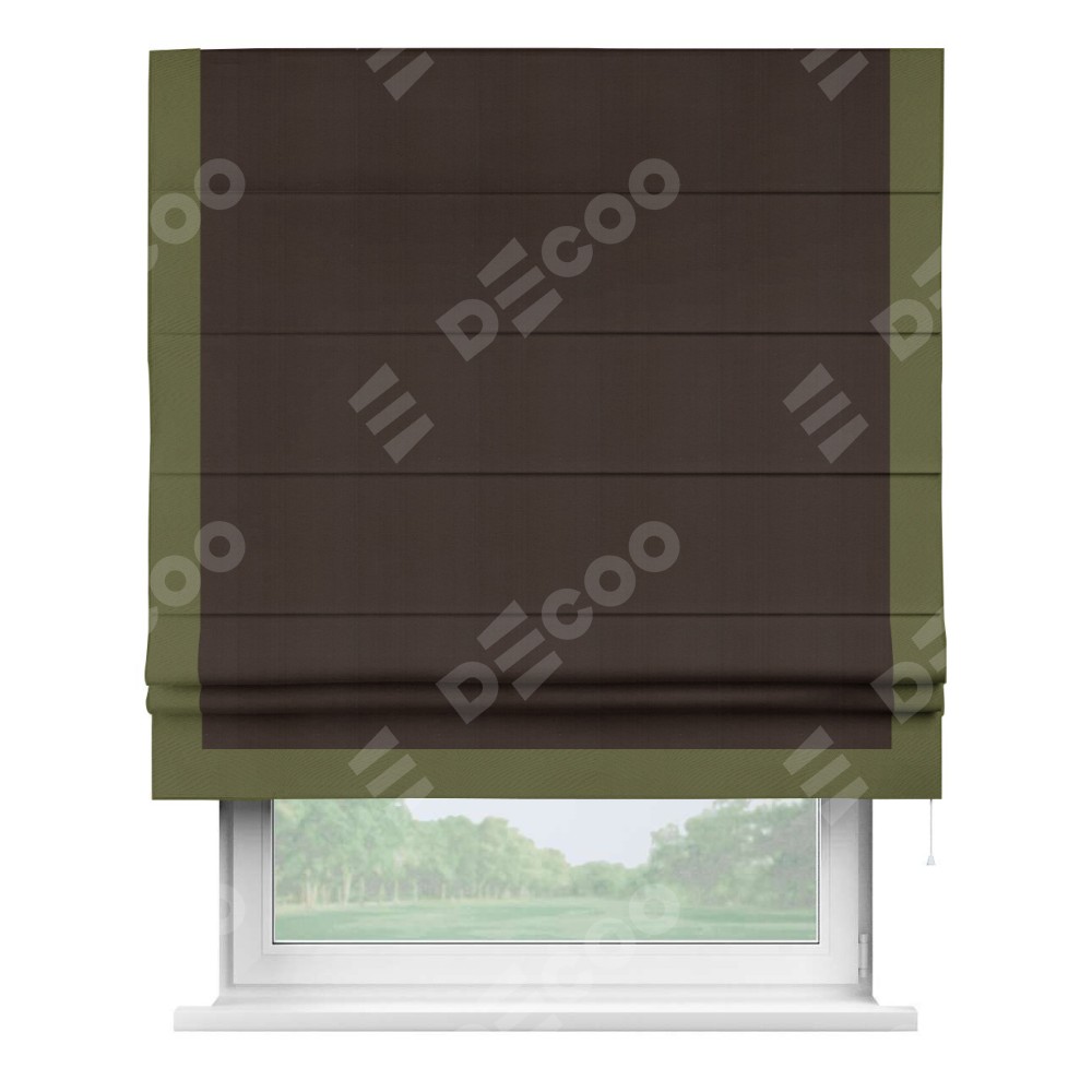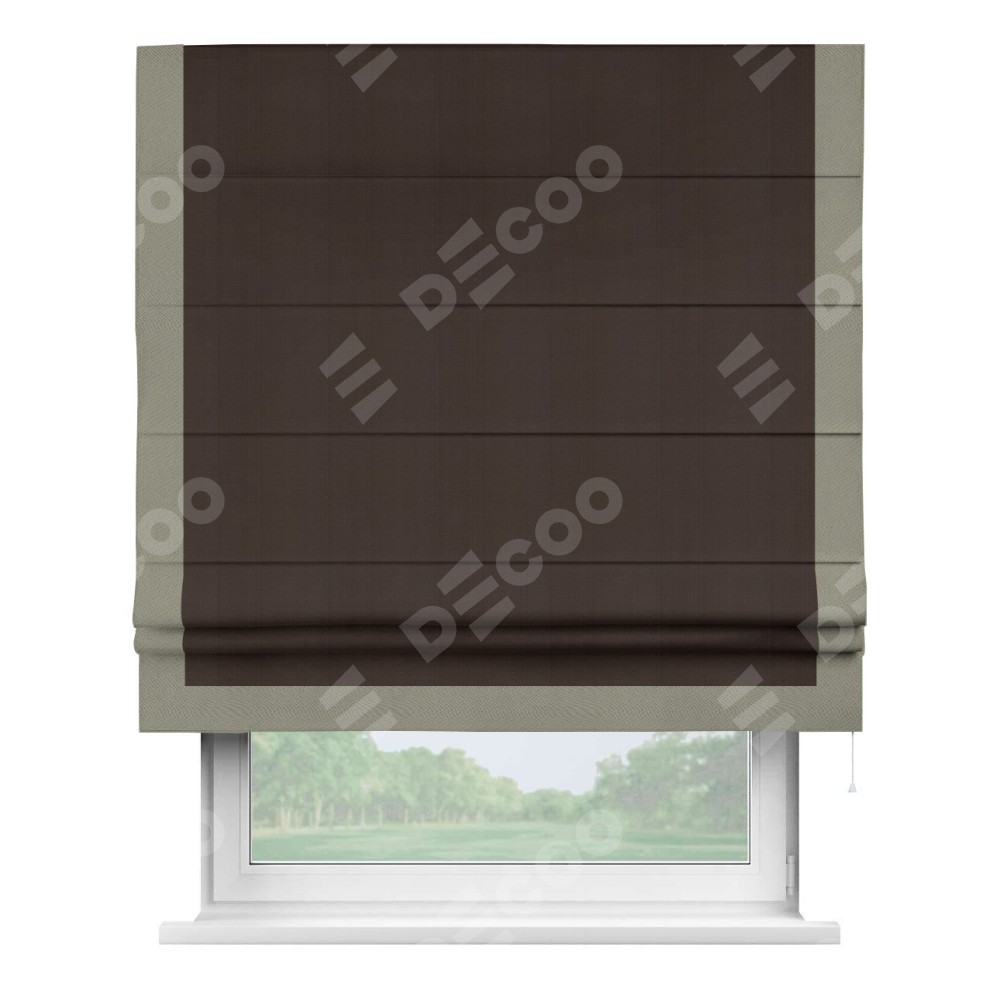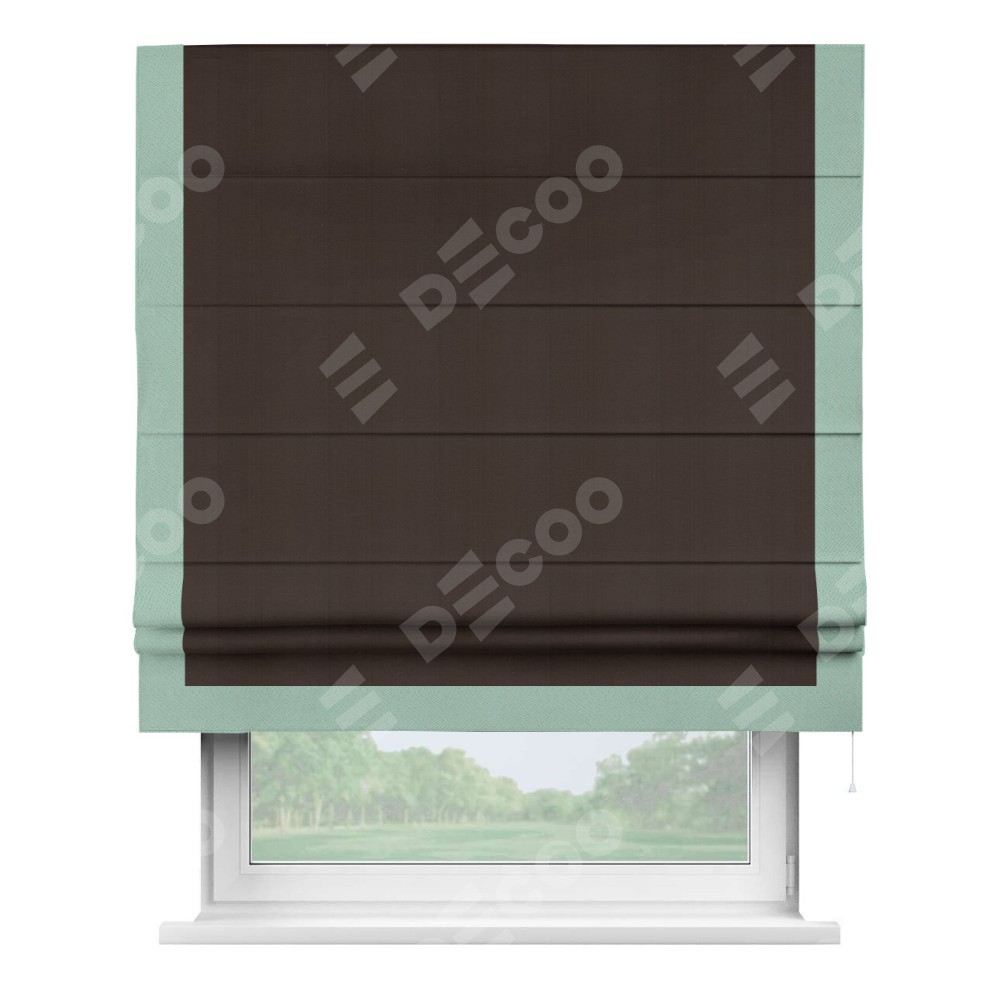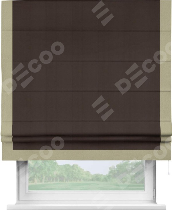 Римская штора производителя «Cortin», используется для проёма, пошита из ткани блэкаут однотонный венге, артикул ткани 88286. Отделка шторы кантом «Виктория», ткань для канта используется из блэкаута однотонного разной расцветки на выбор. Имеет универсальный механизм и подходит для монтажа: на потолок, на стену и в нишу.