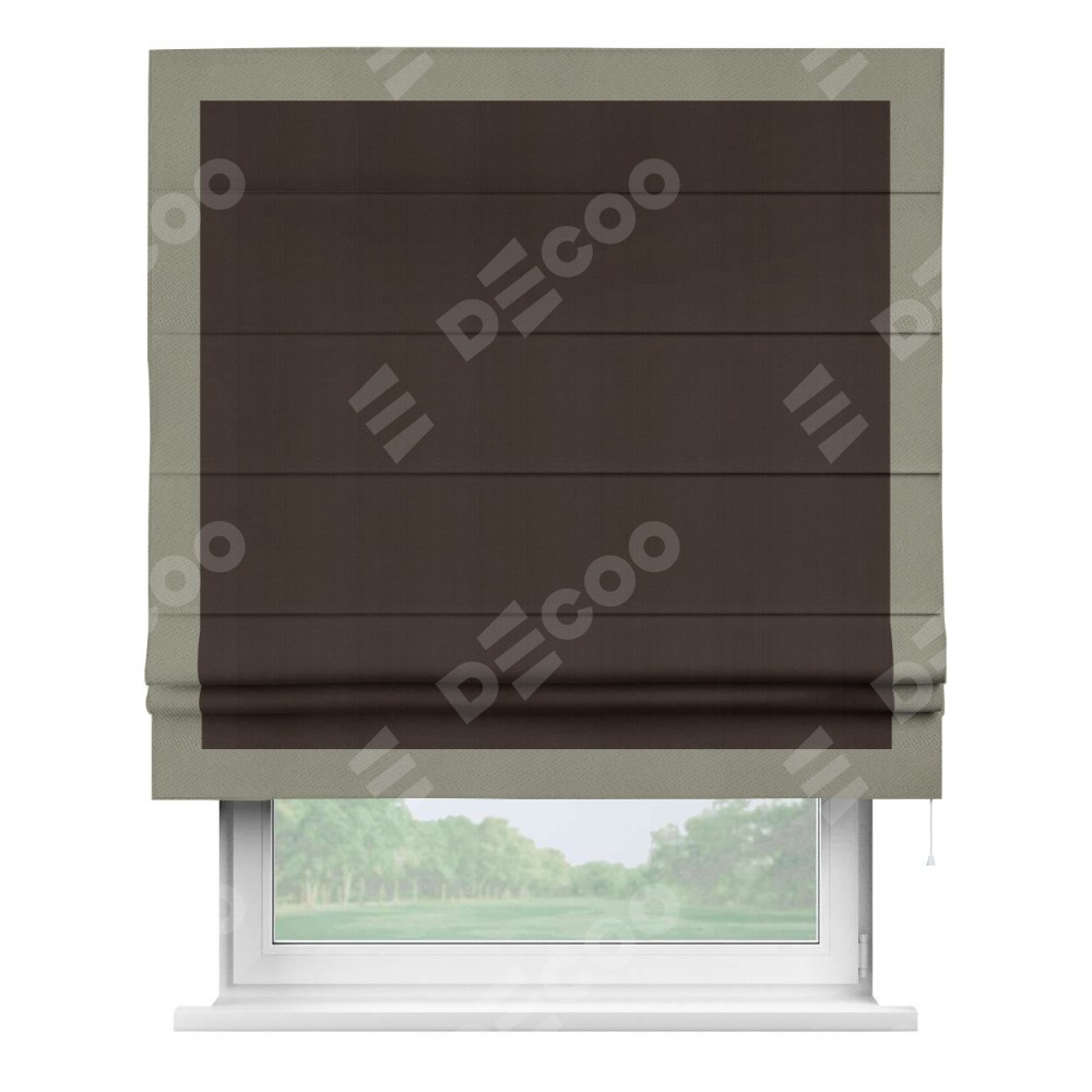 Римская штора производителя «Cortin», используется для проёма, пошита из ткани блэкаут однотонный венге, артикул ткани 88286. Отделка шторы кантом «Чесс», ткань для канта используется из блэкаута однотонного разной расцветки на выбор. Имеет универсальный механизм и подходит для монтажа: на потолок, на стену и в нишу.