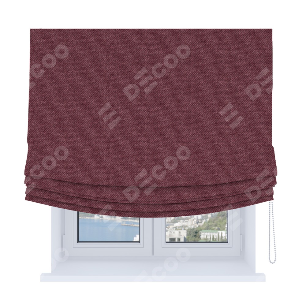 Римская штора Soft производителя «Cortin», используется для проёма, пошита из ткани лён димаут марсала, артикул ткани 1602. Имеет универсальный механизм и подходит для монтажа: на потолок, на стену и в нишу. В отличие от стандартных римских штор, римская штора Soft не имеет горизонтальных вставок и нижнего отвеса. Это позволяет ткани произвольно драпироваться в свободные мягкие складки.