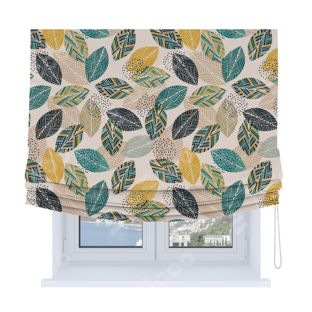 Римская штора Soft производителя «Cortin», используется для проёма, пошита из ткани блэкаут с нанесением сублимационной печати «Листья с орнаментом». Имеет универсальный механизм и подходит для монтажа: на потолок, на стену и в нишу. В отличие от стандартных римских штор, римская штора Soft не имеет горизонтальных вставок и нижнего отвеса. Это позволяет ткани произвольно драпироваться в свободные мягкие складки.