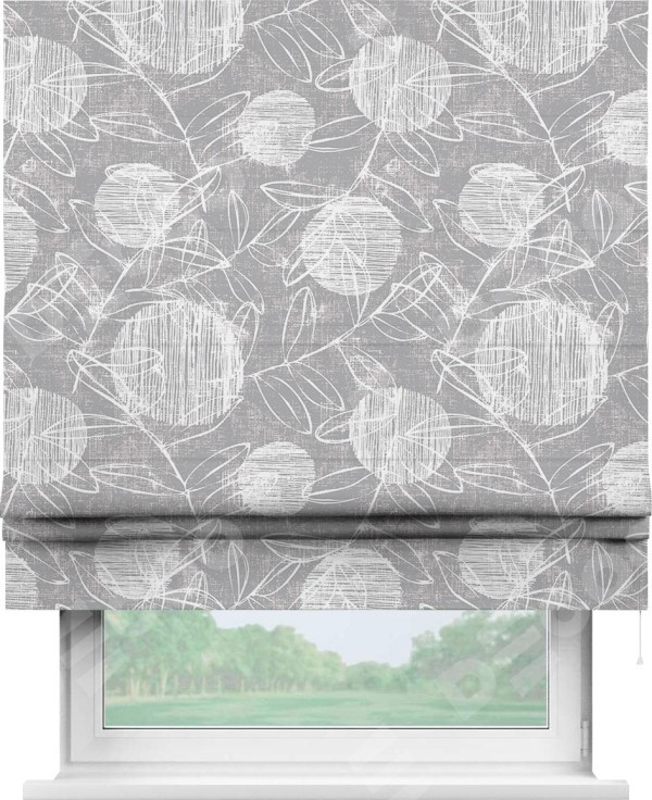 Римская штора производителя «Cortin», используется для проёма, пошита из ткани блэкаут с нанесением сублимационной печати «Серо-белая фантазия». Имеет универсальный механизм и подходит для монтажа: на потолок, на стену и в нишу.