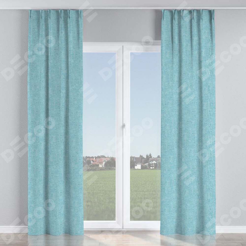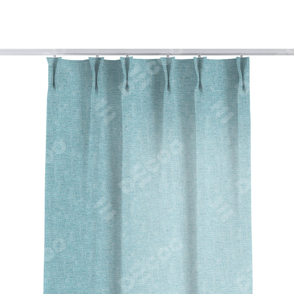 Комплект прямых штор, от производителя «Cortin», пошиты из ткани лён кашемир голубой, артикул ткани 21616. С изнаночной стороны в верхней части штор пристрачивается шторная лента с декоративными складками «Кустик». Для создания элегантных складок прямые шторы шьются по стандарту с коэффициентом 1:2 (на 100 см. ширины проёма 200 см. ширины ткани).
