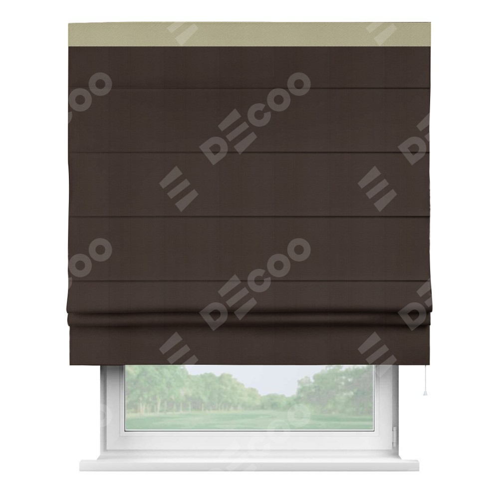 Римская штора производителя «Cortin», используется для проёма, пошита из ткани блэкаут однотонный тёмно-коричневый, артикул ткани 88287. Отделка шторы кантом «Кинг», ткань для канта используется из блэкаута однотонного разной расцветки на выбор. Имеет универсальный механизм и подходит для монтажа: на потолок, на стену и в нишу.