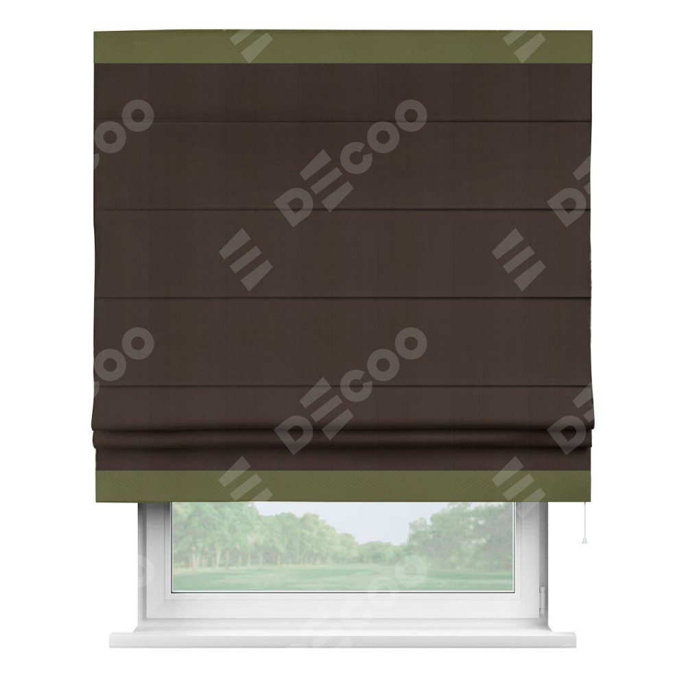 Римская штора производителя «Cortin», используется для проёма, пошита из ткани блэкаут однотонный тёмно-коричневый, артикул ткани 88287. Отделка шторы кантом «Горизонт», ткань для канта используется из блэкаута однотонного разной расцветки на выбор. Имеет универсальный механизм и подходит для монтажа: на потолок, на стену и в нишу.