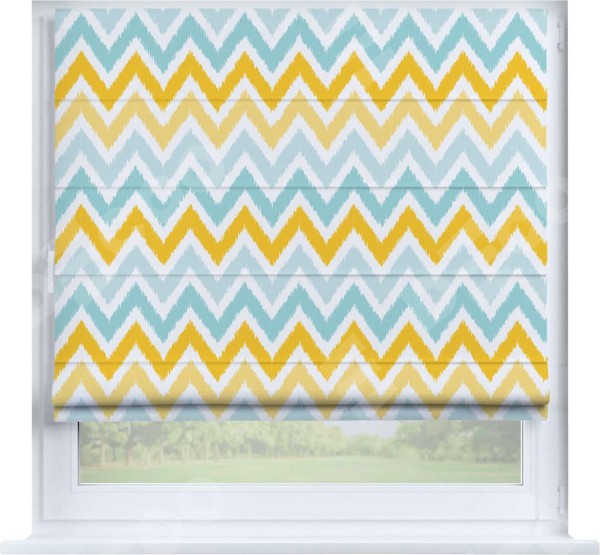 Римская штора производителя «Cortin», устанавливается на створку окна, пошита из ткани блэкаут с нанесением сублимационной печати «Икат шеврон». Штора шьётся по индивидуальным размерам, для данного типа римской шторы возможная ширина от 35 до 150 см., высота до 250 см.