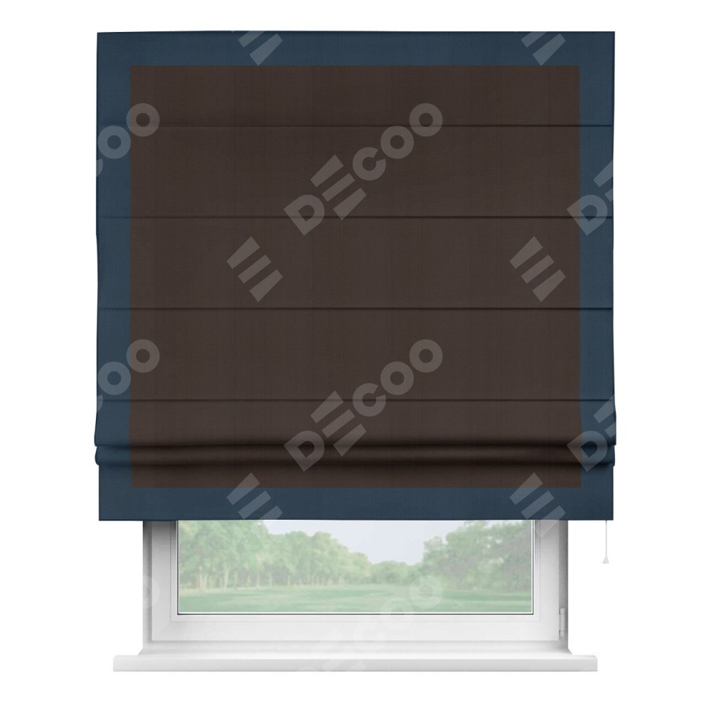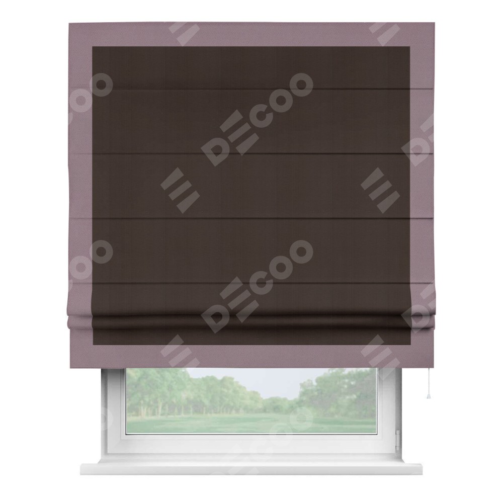 Римская штора производителя «Cortin», используется для проёма, пошита из ткани блэкаут однотонный тёмно-коричневый, артикул ткани 88287. Отделка шторы кантом «Чесс», ткань для канта используется из блэкаута однотонного разной расцветки на выбор. Имеет универсальный механизм и подходит для монтажа: на потолок, на стену и в нишу.