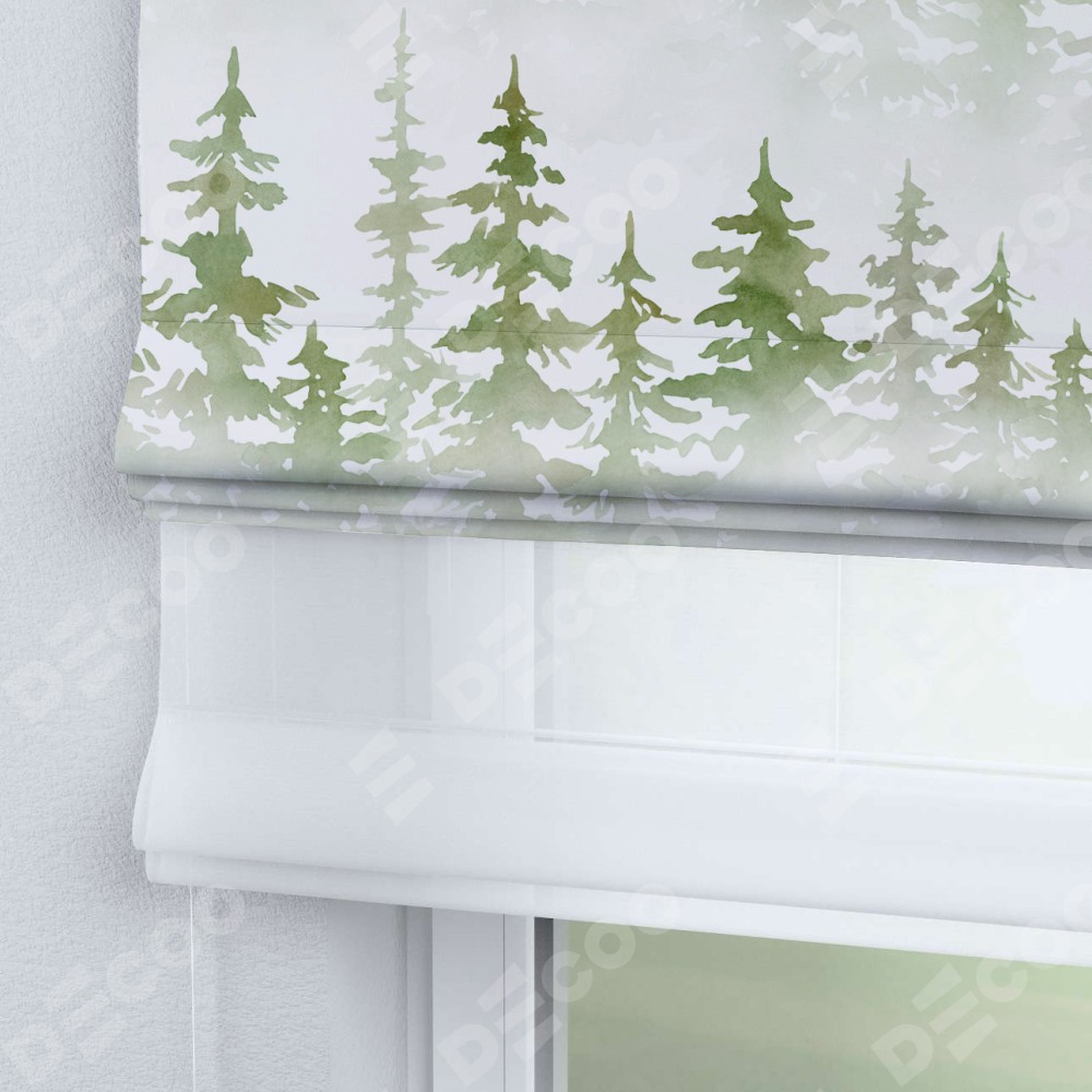 Римская штора день-ночь производителя «Cortin», используется для проёма, пошита из двух полотен, с лицевой блэкаут с нанесением сублимационной печати «Туманный лес», вторая ткань тюль (по стандарту комплектуется тюль белого цвета артикул V-01). Имеет универсальный механизм и подходит для монтажа: на потолок, на стену и в нишу.