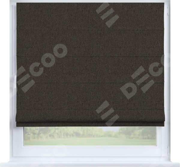 Римская штора производителя «Cortin», устанавливается на створку окна, пошита из ткани твид блэкаут тёмно-коричневый, артикул 21584. Штора шьётся по индивидуальным размерам, для данного типа римской шторы возможная ширина от 35 до 150 см., высота до 250 см.