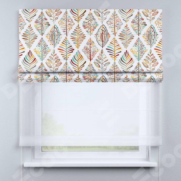 Римская штора день-ночь производителя «Cortin», используется для проёма, пошита из двух полотен, с лицевой блэкаут с нанесением сублимационной печати «Растительные ромбы», вторая ткань тюль (по стандарту комплектуется тюль белого цвета артикул V-01). Имеет универсальный механизм и подходит для монтажа: на потолок, на стену и в нишу.