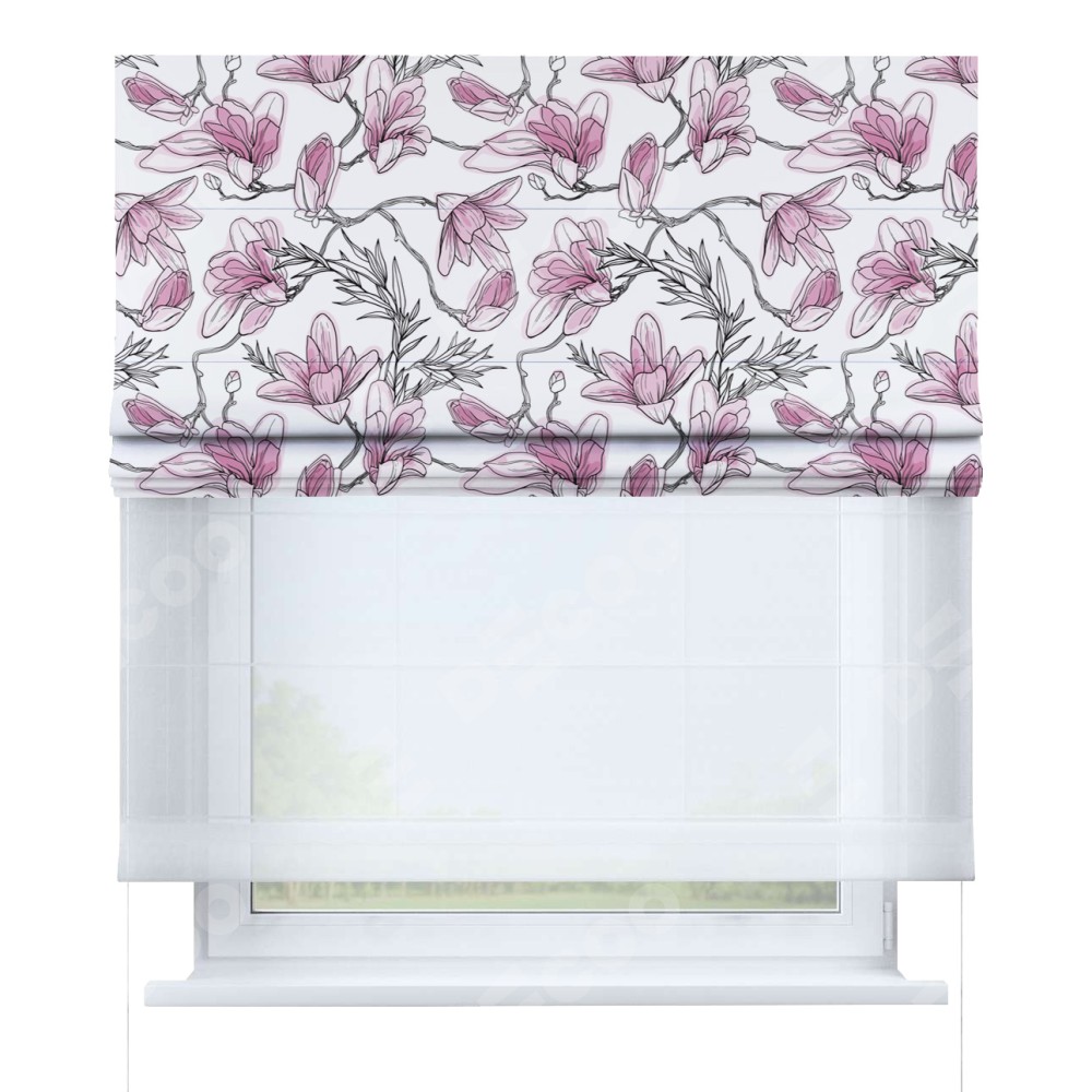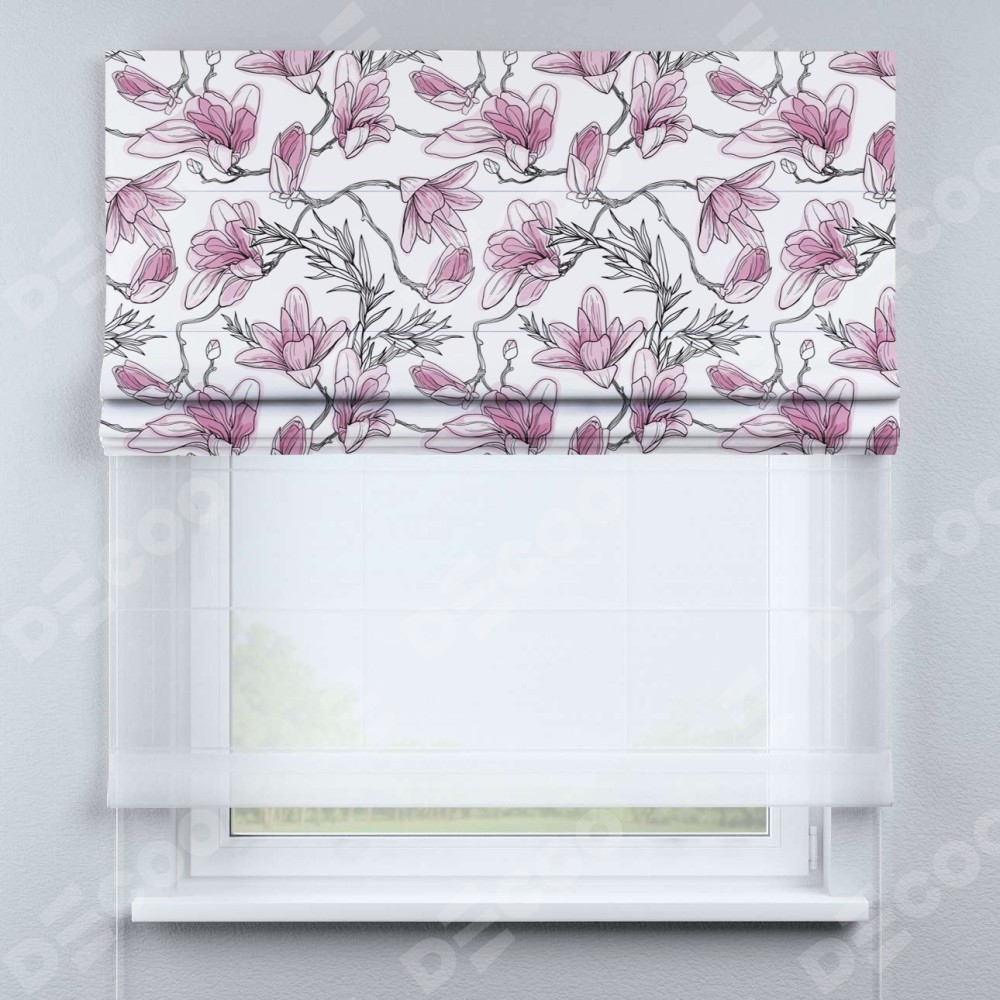 Римская штора день-ночь производителя «Cortin», используется для проёма, пошита из двух полотен, с лицевой блэкаут с нанесением сублимационной печати «Цветки магнолии», вторая ткань тюль (по стандарту комплектуется тюль белого цвета артикул V-01). Имеет универсальный механизм и подходит для монтажа: на потолок, на стену и в нишу.
