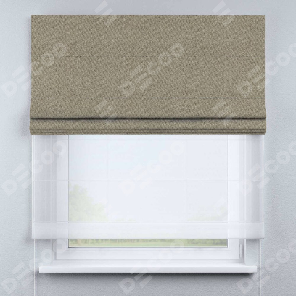 Римская штора день-ночь производителя «Cortin», используется для проёма, пошита из двух полотен, с лицевой стороны твид блэкаут кофе артикул 21575, вторая ткань тюль (по стандарту комплектуется тюль белого цвета артикул V-01). Имеет универсальный механизм и подходит для монтажа: на потолок, на стену и в нишу.