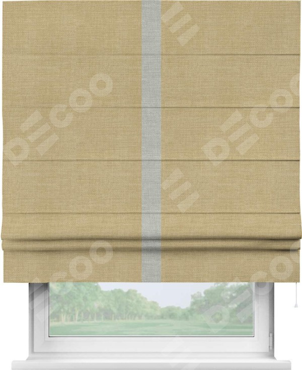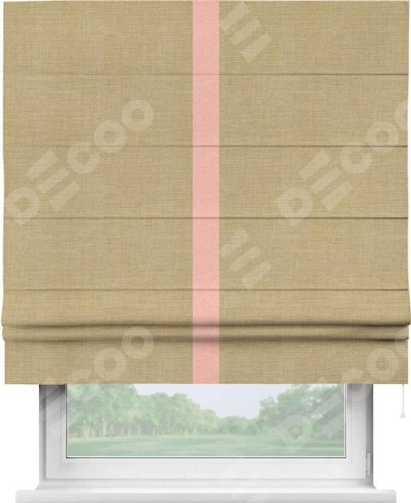 Римская штора производителя «Cortin», используется для проёма, пошита из ткани лён бежевый, артикул 7442. Отделка шторы кантом «Хайвэй», ткань для канта используется из льна разной расцветки на выбор. Имеет универсальный механизм и подходит для монтажа: на потолок, на стену и в нишу.