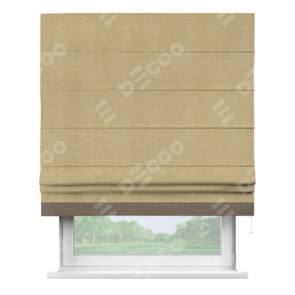 Римская штора производителя «Cortin», используется для проёма, пошита из ткани лён бежевый, артикул 7442. Отделка шторы кантом «Джестер», ткань для канта используется из льна разной расцветки на выбор. Имеет универсальный механизм и подходит для монтажа: на потолок, на стену и в нишу.