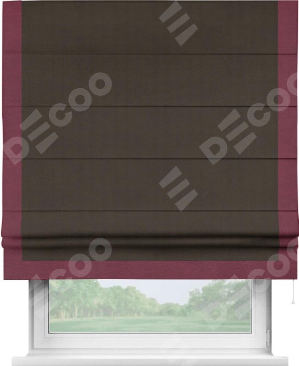 Римская штора производителя «Cortin», используется для проёма, пошита из ткани вельвет тёмно-коричневый, артикул ткани 30991. Отделка шторы кантом «Виктория», ткань для канта используется из вельвета разной расцветки на выбор. Имеет универсальный механизм и подходит для монтажа: на потолок, на стену и в нишу.