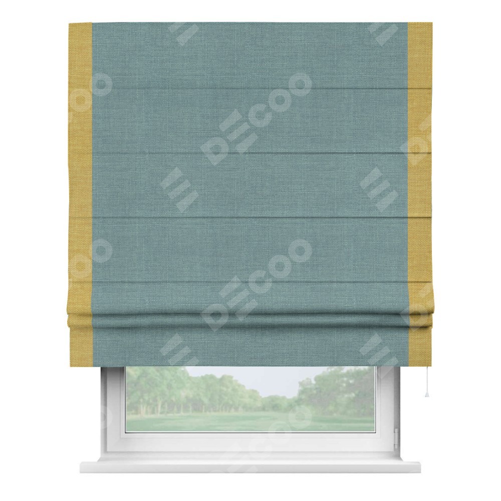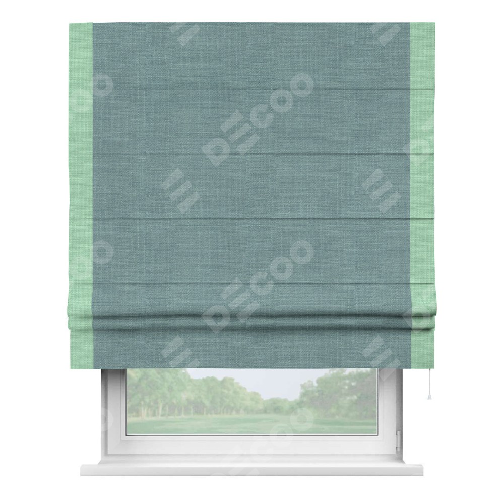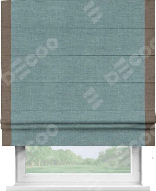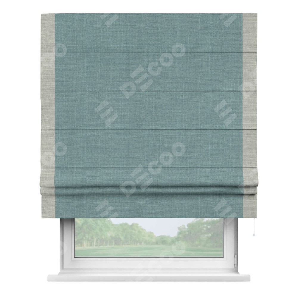 Римская штора производителя «Cortin», используется для проёма, пошита из ткани лён голубой, артикул 74736. Отделка шторы кантом «Стрим Дуо», ткань для канта используется из льна разной расцветки на выбор. Имеет универсальный механизм и подходит для монтажа: на потолок, на стену и в нишу.