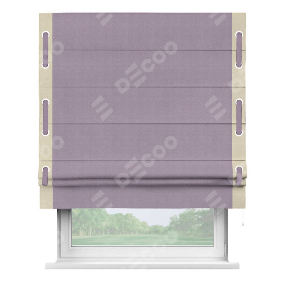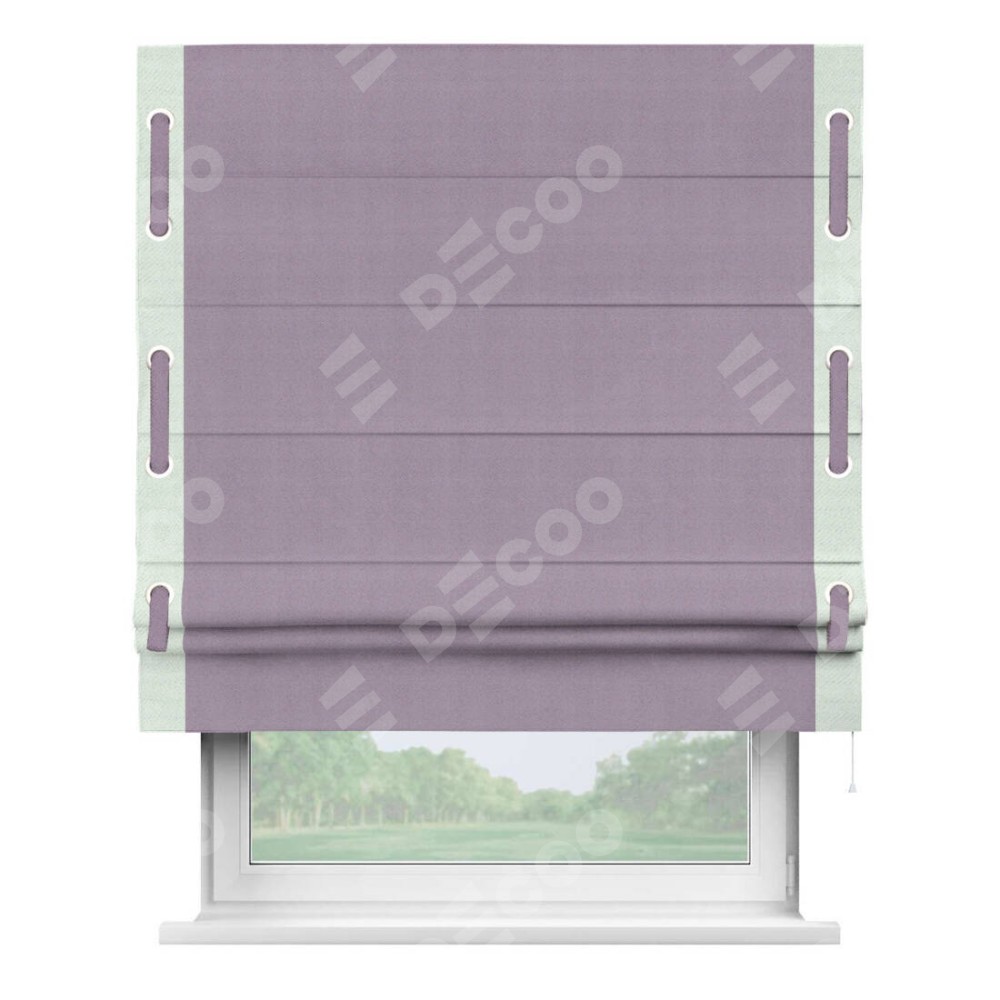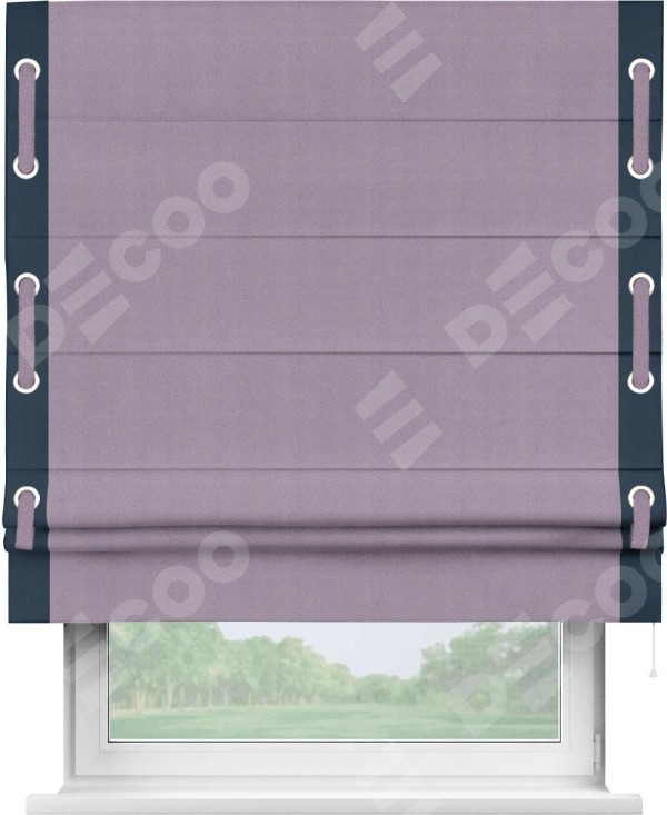 Римская штора производителя «Cortin», используется для проёма, пошита из ткани блэкаут однотонный светло-сиреневый, артикул ткани 29333−1. Отделка шторы кантом «Стрим Дуо» на кантах расположены люверсы с пояском, ткань для канта используется из блэкаута однотонного разной расцветки на выбор. Ткань для пояска обычно используется из основной ткани шторы, а так же можно сделать из любой расцветки по желанию. Имеет универсальный механизм и подходит для монтажа: на потолок, на стену и в нишу.