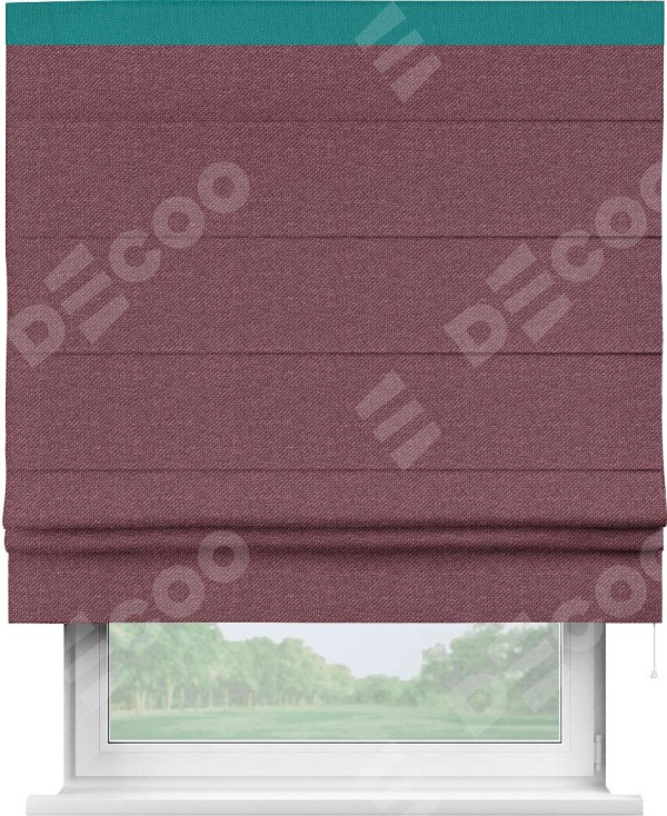Римская штора производителя «Cortin», используется для проёма, пошита из ткани лён димаут марсала, артикул 1602. Отделка шторы кантом «Кинг», ткань для канта используется из льна димаут разной расцветки на выбор. Имеет универсальный механизм и подходит для монтажа: на потолок, на стену и в нишу.