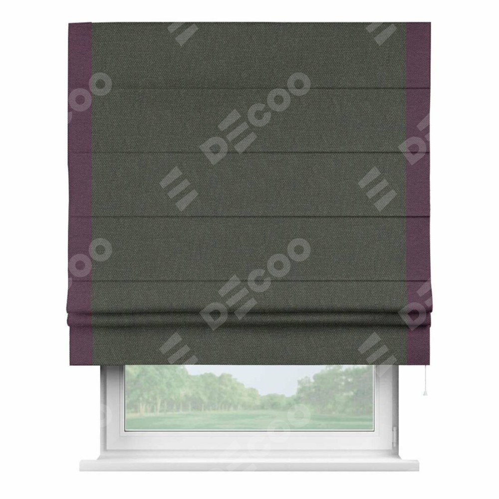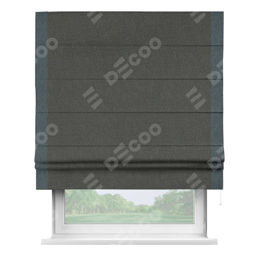 Римская штора производителя «Cortin», используется для проёма, пошита из ткани лён димаут графитово-серый, артикул 35129. Отделка шторы кантом «Стрим Дуо», ткань для канта используется из льна димаут разной расцветки на выбор. Имеет универсальный механизм и подходит для монтажа: на потолок, на стену и в нишу.