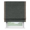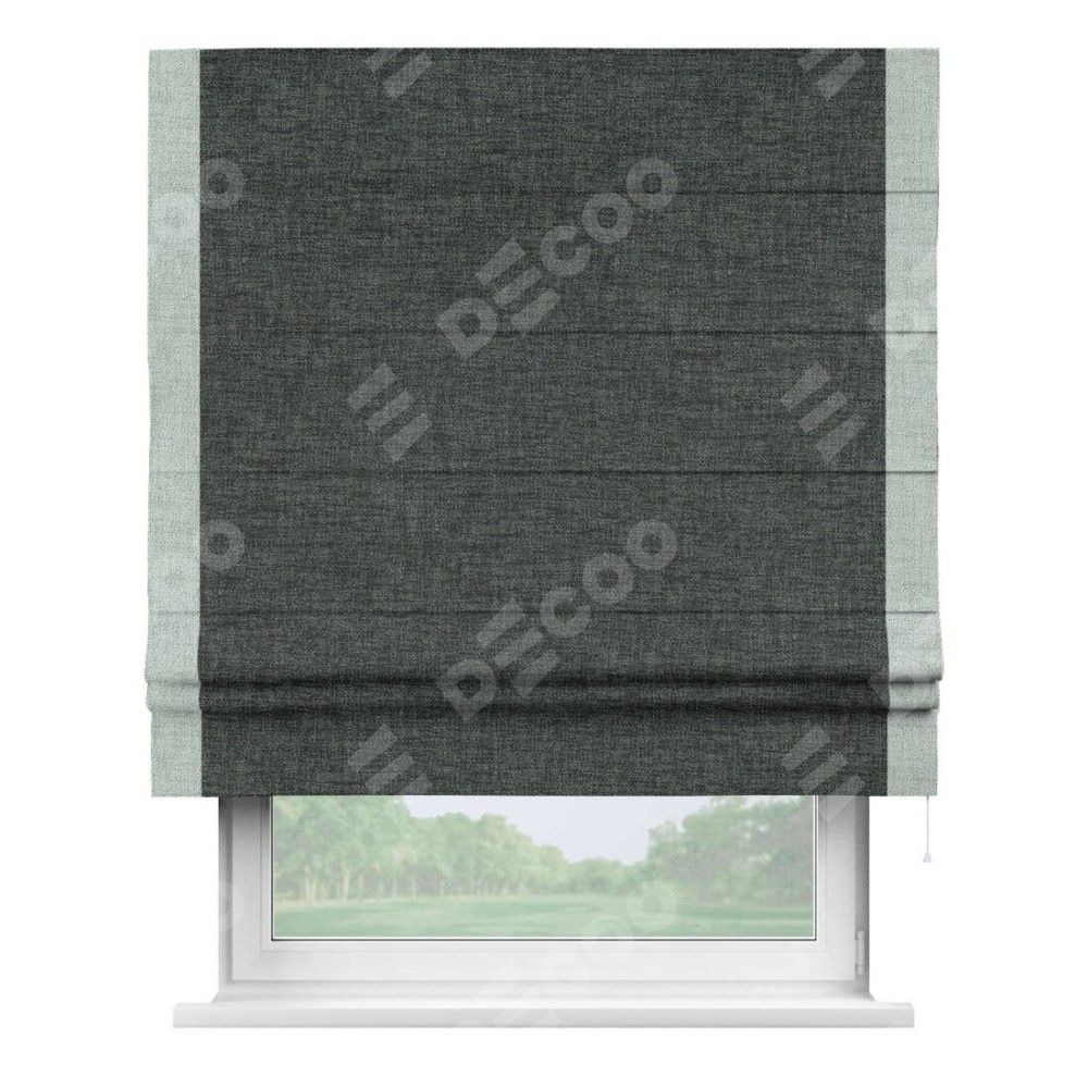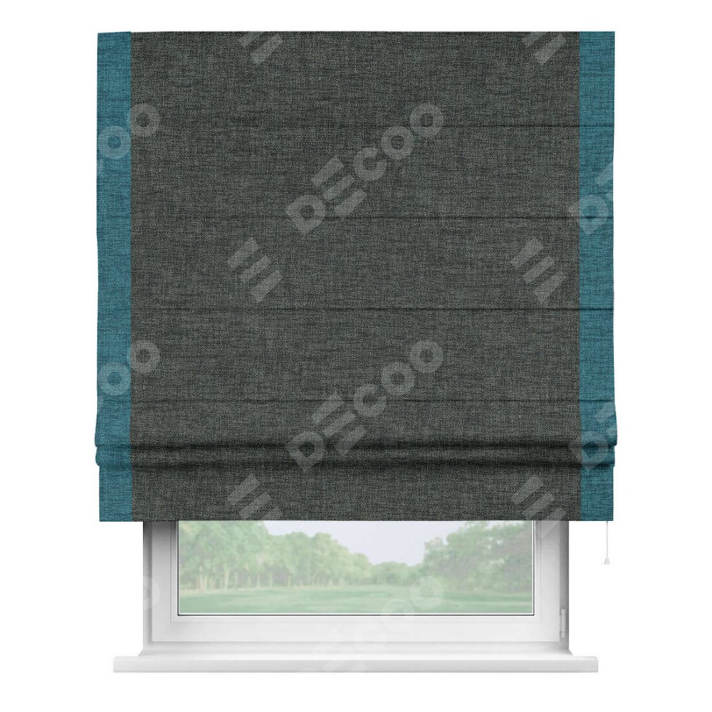 Римская штора производителя «Cortin», используется для проёма, пошита из ткани рогожка димаут графит, артикул 102−34. Отделка шторы кантом «Стрим Дуо», ткань для канта используется из рогожки димаут разной расцветки на выбор. Имеет универсальный механизм и подходит для монтажа: на потолок, на стену и в нишу.