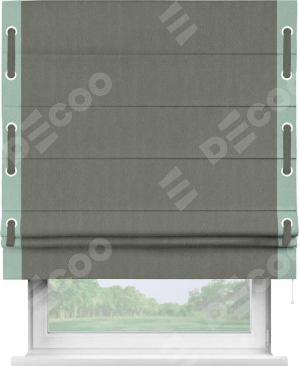 Римская штора производителя «Cortin», используется для проёма, пошита из ткани блэкаут однотонный тёмно-серый, артикул ткани 29332−1. Отделка шторы кантом «Стрим Дуо» на кантах расположены люверсы с пояском, ткань для канта используется из блэкаута однотонного разной расцветки на выбор. Ткань для пояска обычно используется из основной ткани шторы, а так же можно сделать из любой расцветки по желанию. Имеет универсальный механизм и подходит для монтажа: на потолок, на стену и в нишу.