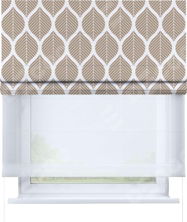 Римская штора день-ночь производителя «Cortin», используется для проёма, пошита из двух полотен, с лицевой блэкаут с нанесением сублимационной печати «Листья геометрия», вторая ткань тюль (по стандарту комплектуется тюль белого цвета артикул V-01). Имеет универсальный механизм и подходит для монтажа: на потолок, на стену и в нишу.