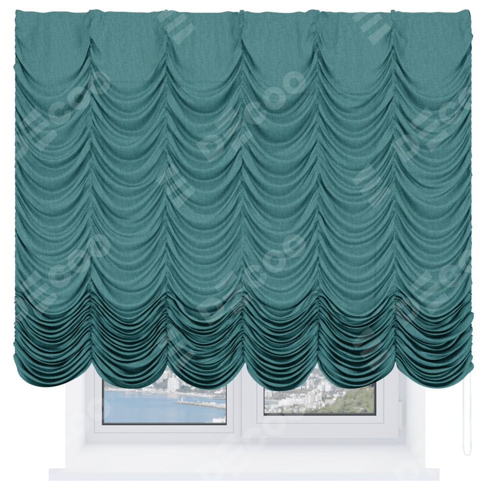 Французская штора производителя «Cortin», используется для проёма, пошита из ткани лён кашемир бирюзовый, артикул ткани 17214. Имеет универсальный механизм и подходит для монтажа: на потолок и на стену.