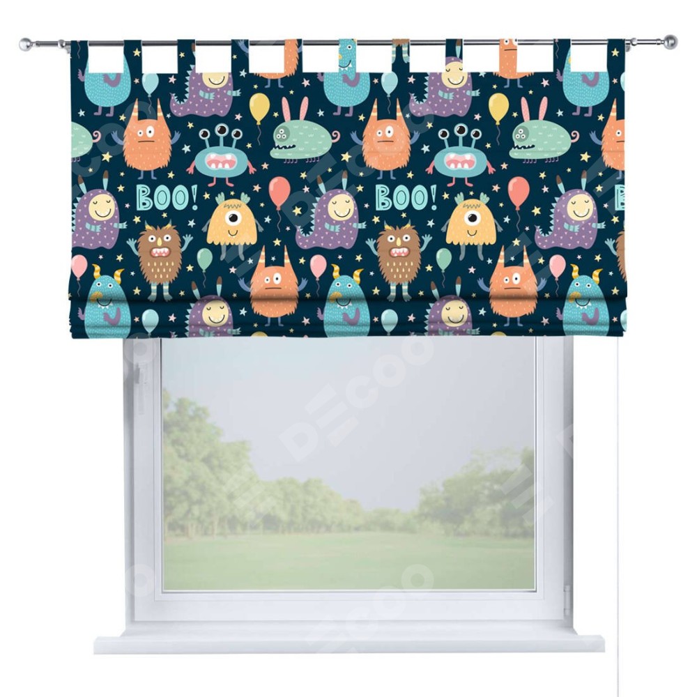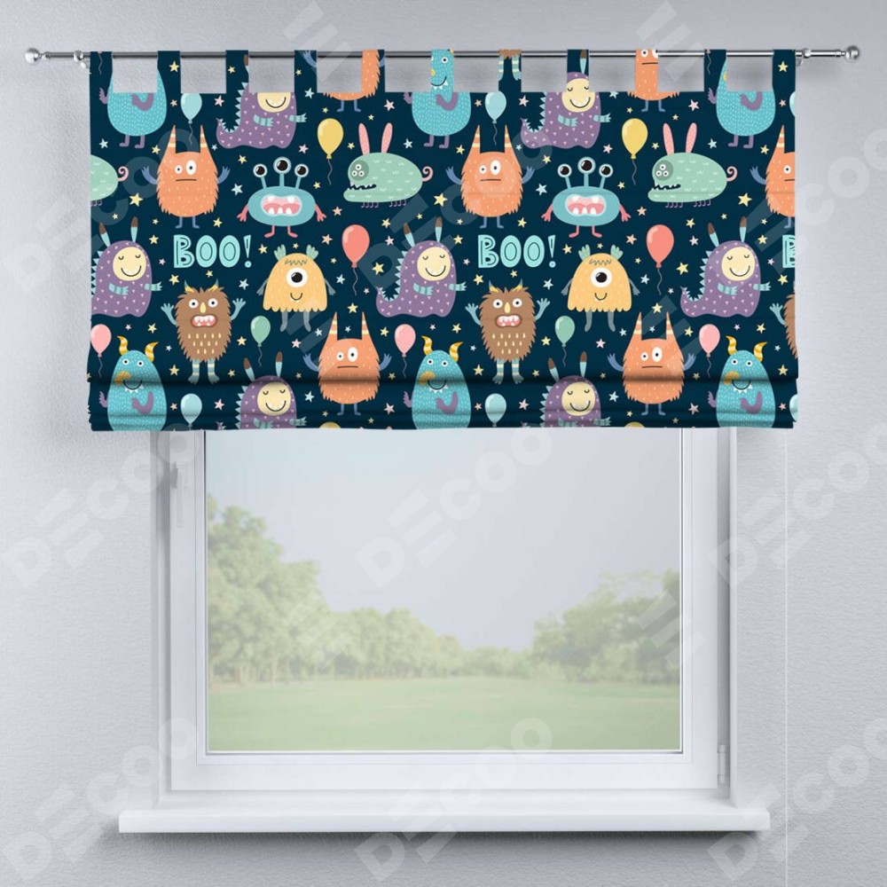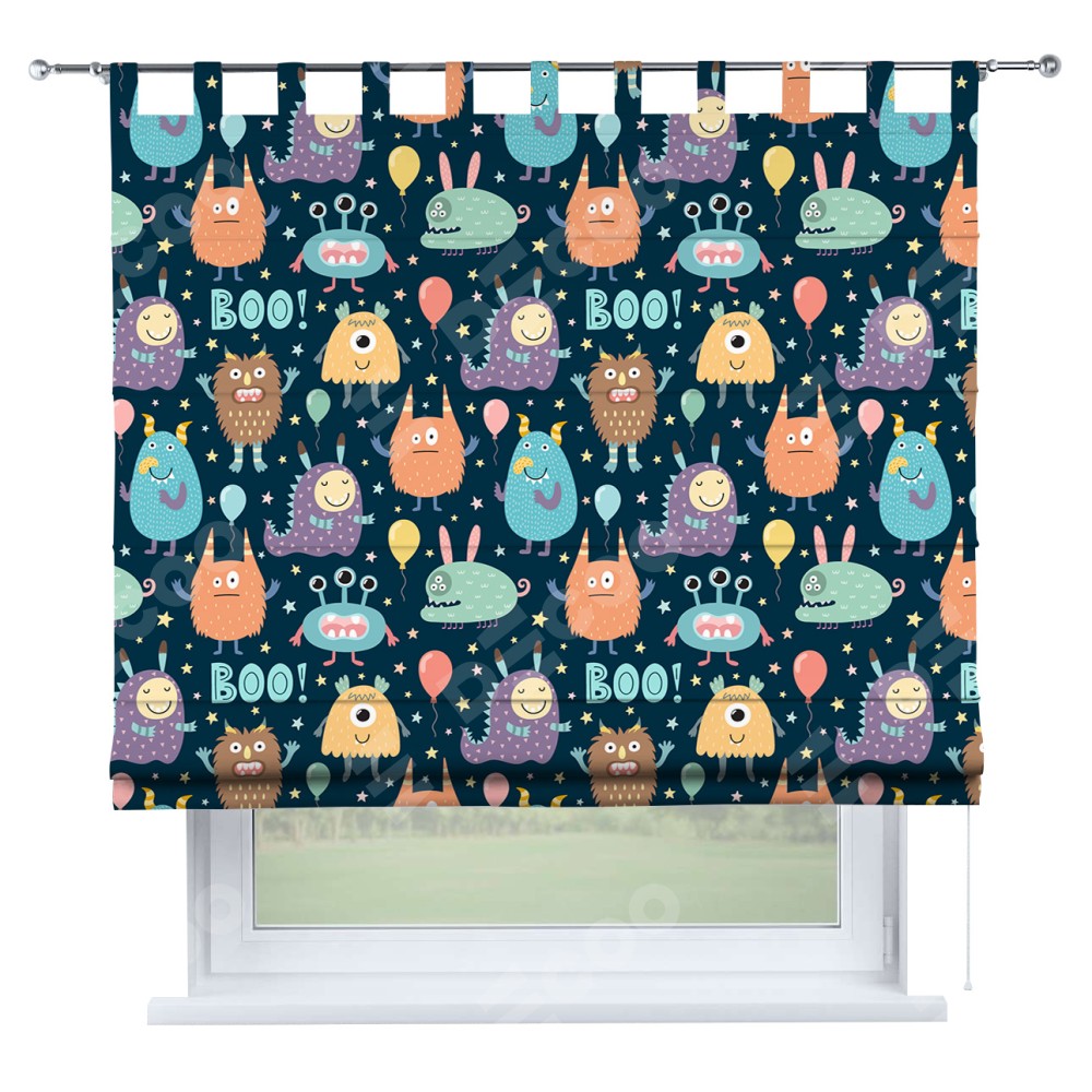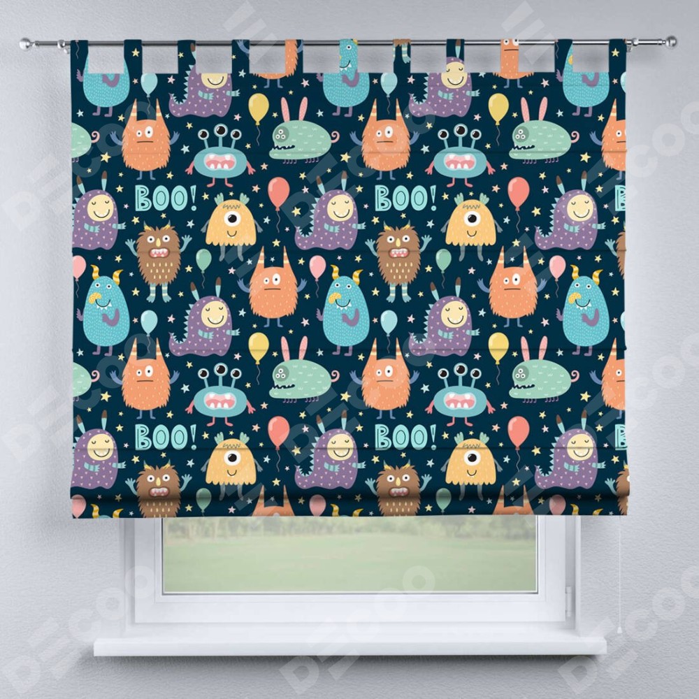 Римская штора производителя «Cortin», используется для проёма, пошита из ткани блэкаут с нанесением сублимационной печати «Звёздные страшилки». Данная модель пошита на петлях, комплектуется на выбор круглым карнизом и подходит для монтажа на стену. Римская штора на петлях имеет простую систему регулировки высоты, отличительным преимуществом данной модели является простой способ монтажа. Достаточно повесить ее на трубу и штора готова!