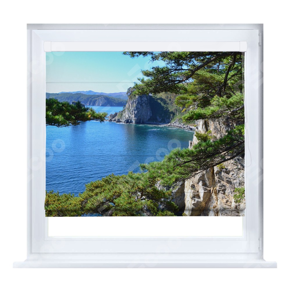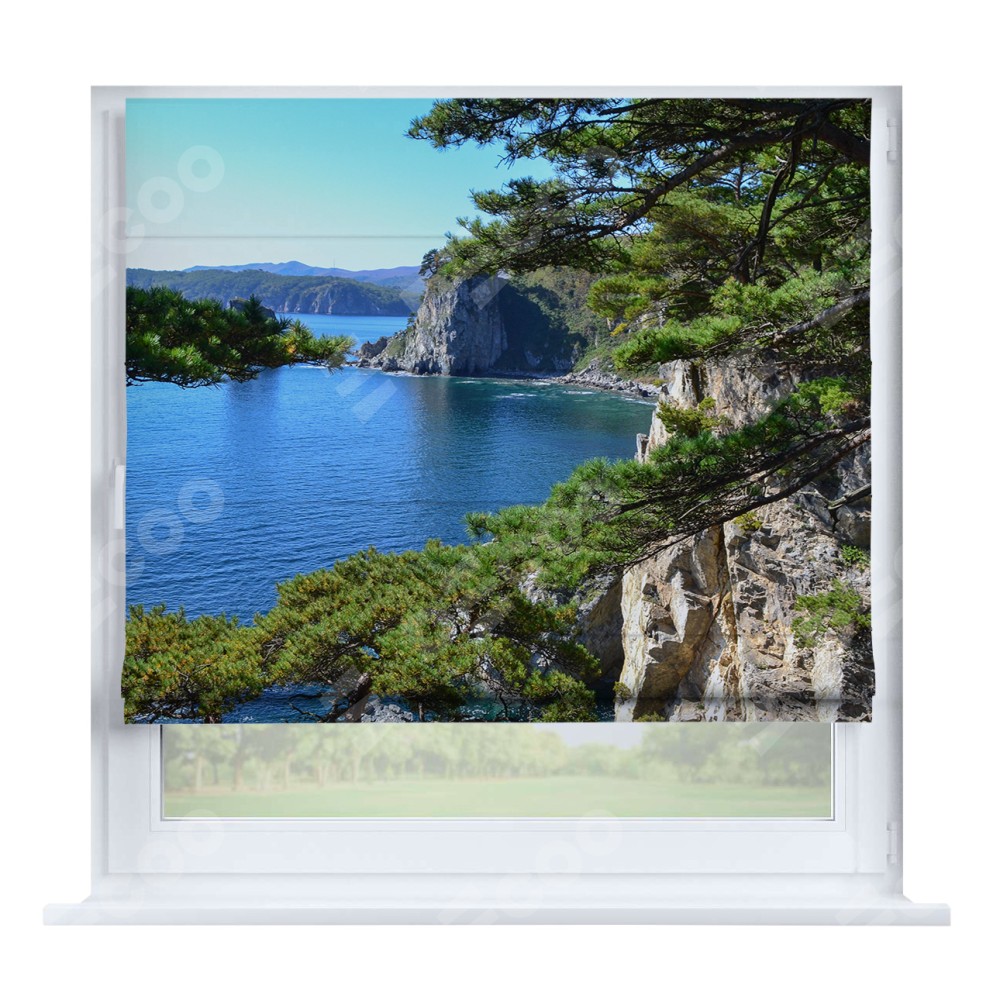 Римская штора производителя «Cortin», устанавливается на створку окна, пошита из ткани блэкаут с нанесением сублимационной печати «Море и сосны». Штора шьётся по индивидуальным размерам, для данного типа римской шторы возможная ширина от 35 до 150 см., высота до 250 см.