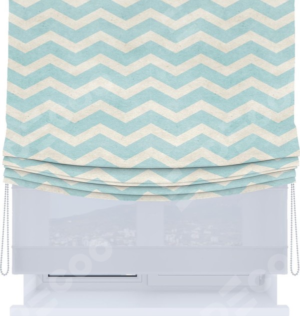 Римская штора день-ночь производителя «Cortin», используется для проёма, пошита из двух полотен, с лицевой блэкаут с нанесением сублимационной печати «Голубой шеврон», вторая ткань тюль (по стандарту комплектуется тюль белого цвета артикул V-01). Имеет универсальный механизм и подходит для монтажа: на потолок, на стену и в нишу. Удобное управление каждой шторой отдельно.