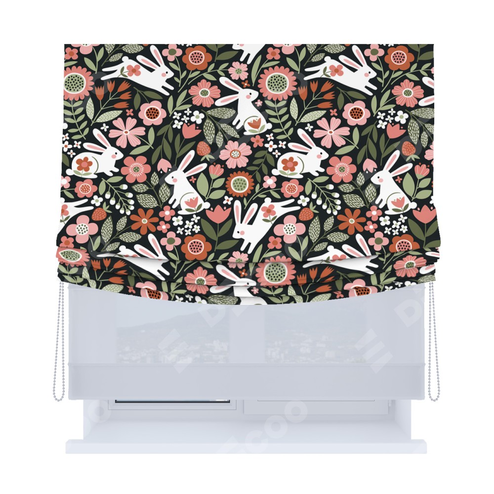 Римская штора «Кортин», день-ночь с мягкими складками, «Зайчики в цветнике»