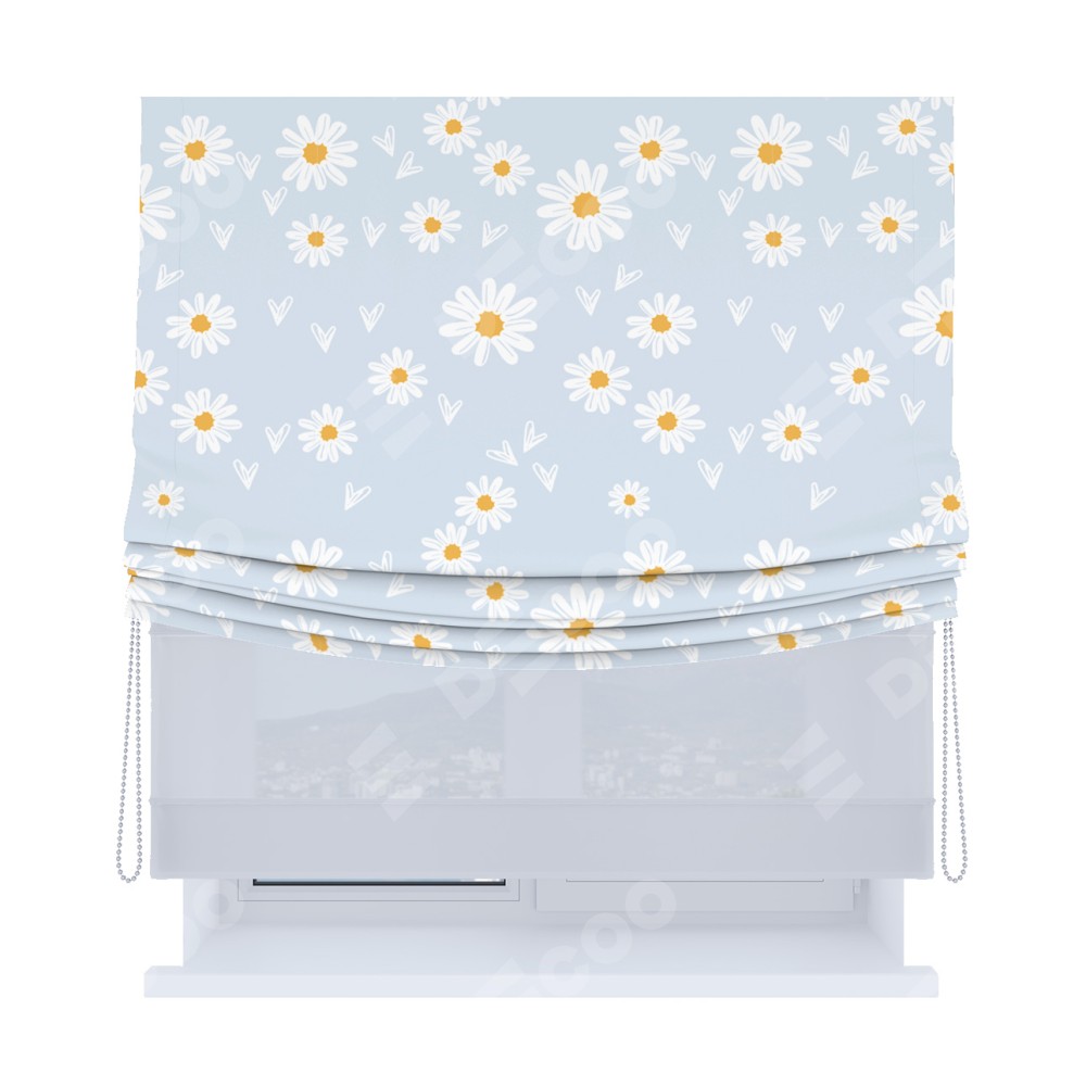 Римская штора день-ночь производителя «Cortin», используется для проёма, пошита из двух полотен, с лицевой блэкаут с нанесением сублимационной печати «Летние ромашки», вторая ткань тюль (по стандарту комплектуется тюль белого цвета артикул V-01). Имеет универсальный механизм и подходит для монтажа: на потолок, на стену и в нишу. Удобное управление каждой шторой отдельно.