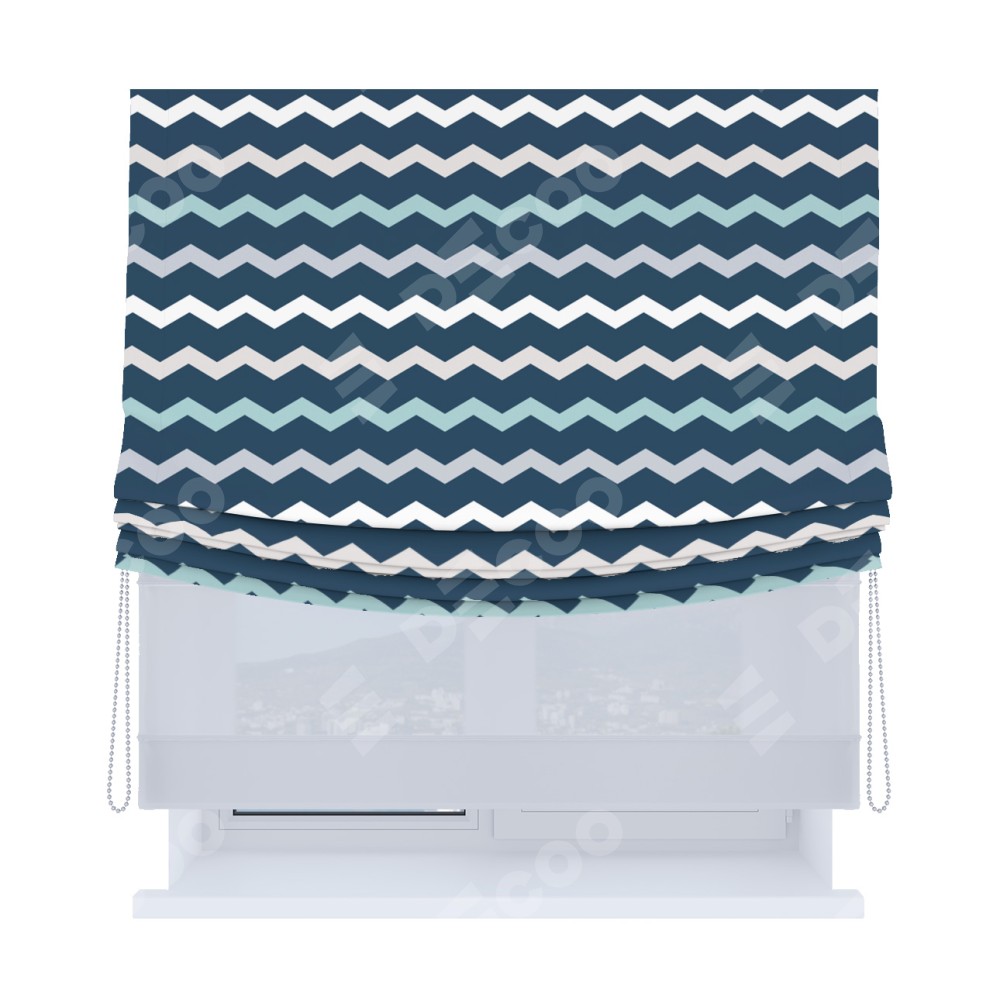 Римская штора день-ночь производителя «Cortin», используется для проёма, пошита из двух полотен, с лицевой блэкаут с нанесением сублимационной печати «Морской шеврон», вторая ткань тюль (по стандарту комплектуется тюль белого цвета артикул V-01). Имеет универсальный механизм и подходит для монтажа: на потолок, на стену и в нишу. Удобное управление каждой шторой отдельно.