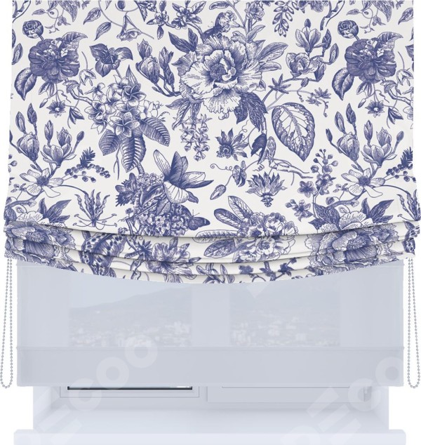 Римская штора день-ночь производителя «Cortin», используется для проёма, пошита из двух полотен, с лицевой блэкаут с нанесением сублимационной печати «Прованс в синем», вторая ткань тюль (по стандарту комплектуется тюль белого цвета артикул V-01). Имеет универсальный механизм и подходит для монтажа: на потолок, на стену и в нишу. Удобное управление каждой шторой отдельно.