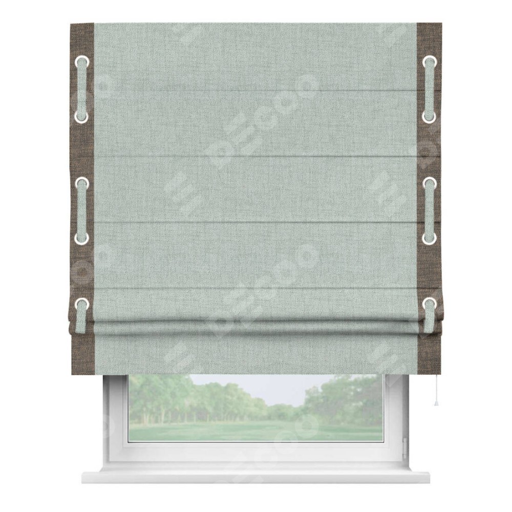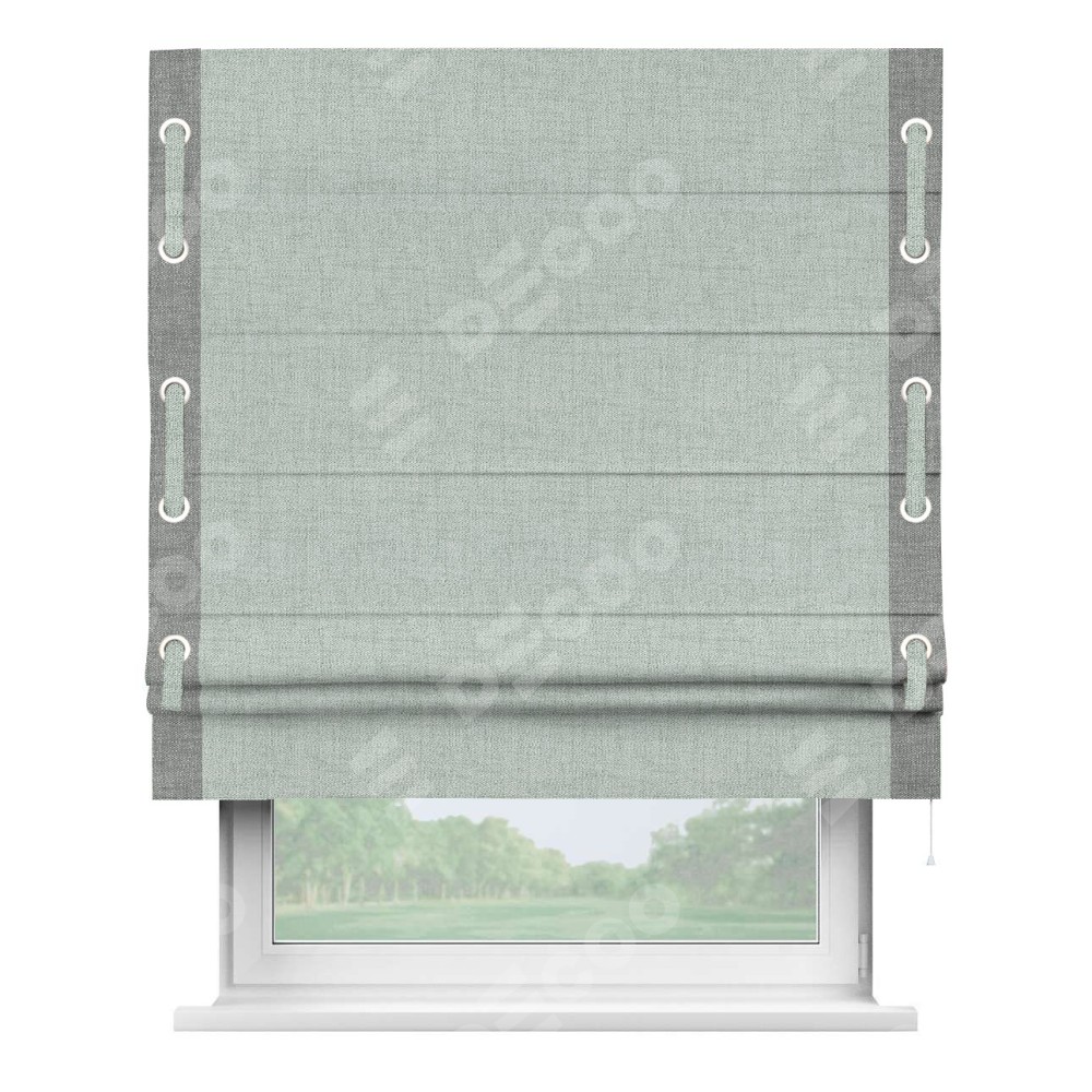 Римская штора производителя «Cortin», используется для проёма, пошита из ткани рогожка димаут серый, артикул 80426. Отделка шторы кантом «Стрим Дуо» на кантах расположены люверсы с пояском, ткань для канта используется из рогожки разной расцветки на выбор. Ткань для пояска обычно используется из основной ткани шторы, а так же можно сделать из любой расцветки по желанию. Имеет универсальный механизм и подходит для монтажа: на потолок, на стену и в нишу.