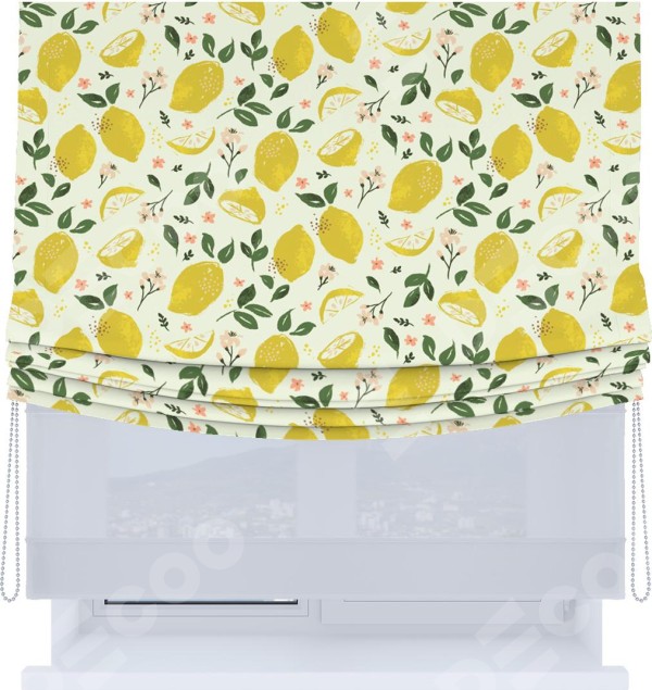 Римская штора день-ночь производителя «Cortin», используется для проёма, пошита из двух полотен, с лицевой блэкаут с нанесением сублимационной печати «Сочные лимоны», вторая ткань тюль (по стандарту комплектуется тюль белого цвета артикул V-01). Имеет универсальный механизм и подходит для монтажа: на потолок, на стену и в нишу. Удобное управление каждой шторой отдельно.