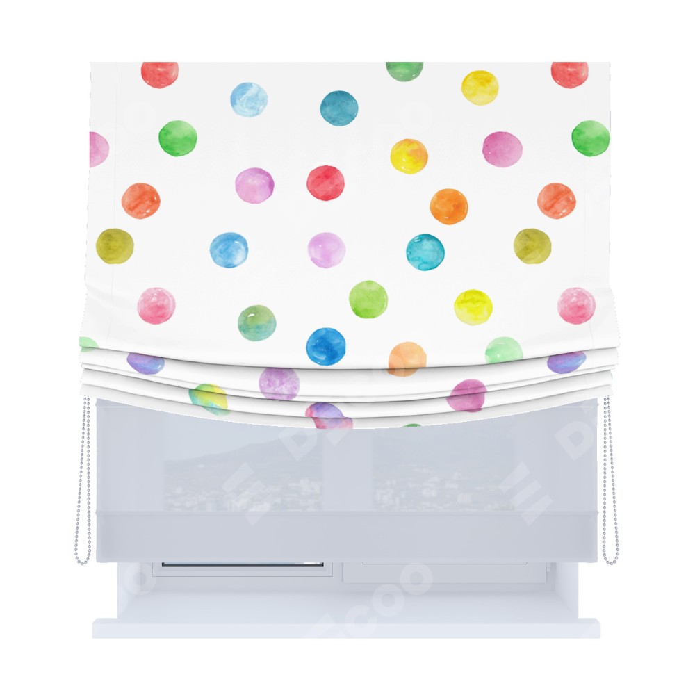 Римская штора день-ночь производителя «Cortin», используется для проёма, пошита из двух полотен, с лицевой блэкаут с нанесением сублимационной печати «Цветные круги», вторая ткань тюль (по стандарту комплектуется тюль белого цвета артикул V-01). Имеет универсальный механизм и подходит для монтажа: на потолок, на стену и в нишу. Удобное управление каждой шторой отдельно.