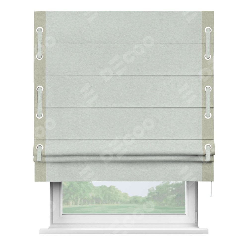 Римская штора производителя «Cortin», используется для проёма, пошита из ткани лён блэкаут белый, артикул 69451. Отделка шторы кантом «Стрим Дуо» на кантах расположены люверсы с пояском, ткань для канта используется из льна разной расцветки на выбор. Ткань для пояска обычно используется из основной ткани шторы, а так же можно сделать из любой расцветки по желанию. Имеет универсальный механизм и подходит для монтажа: на потолок, на стену и в нишу.