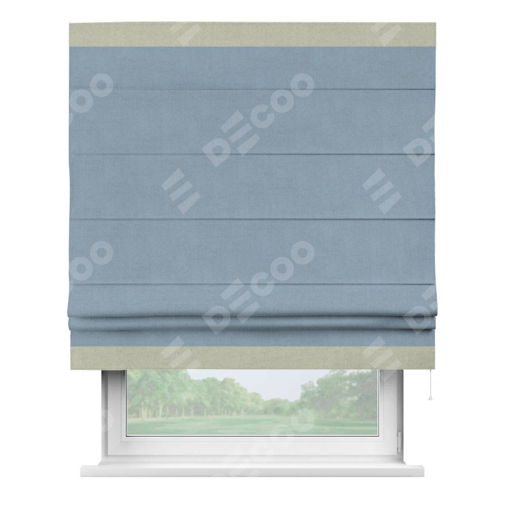 Римская штора производителя «Cortin», используется для проёма, пошита из ткани лён блэкаут голубой, артикул 69574. Отделка шторы кантом «Горизонт», ткань для канта используется из льна разной расцветки на выбор. Имеет универсальный механизм и подходит для монтажа: на потолок, на стену и в нишу.
