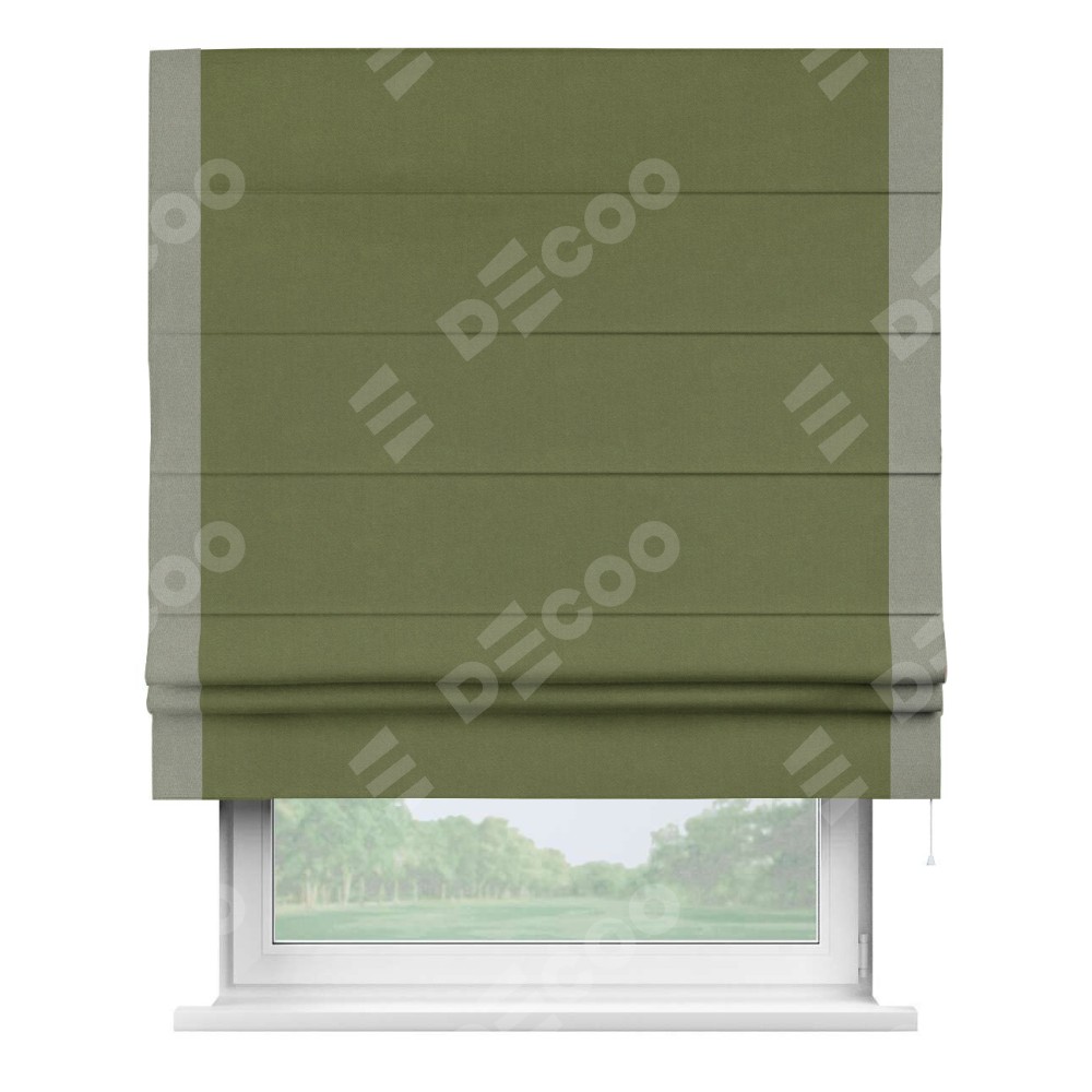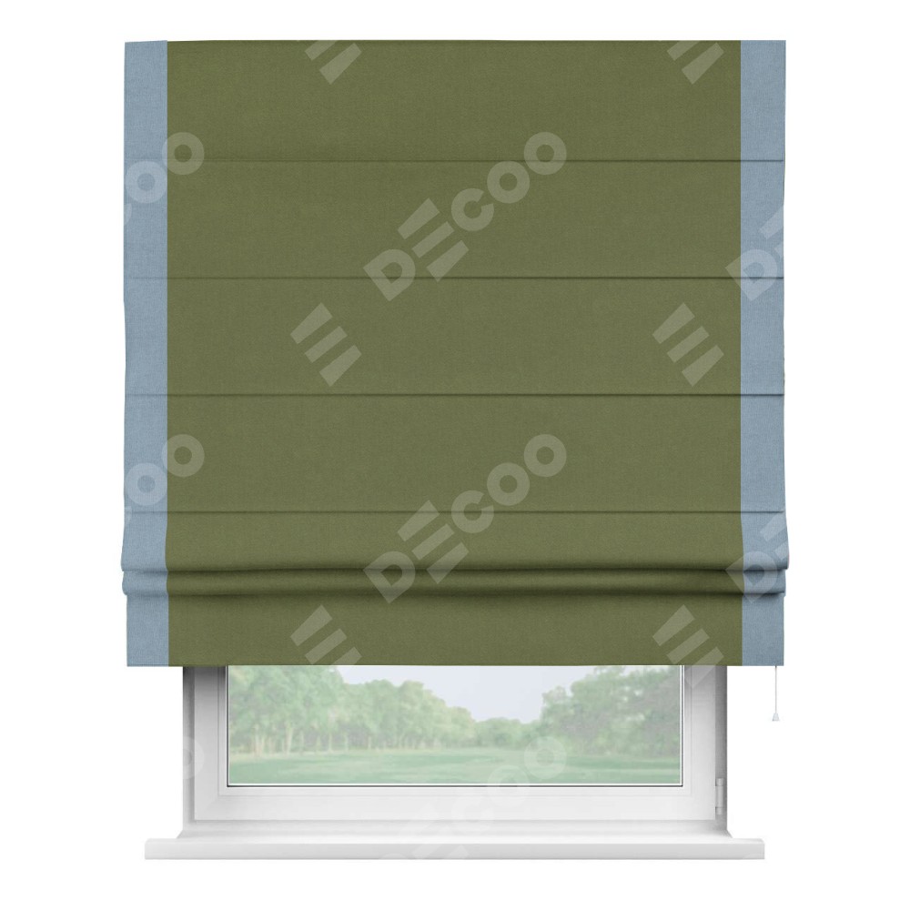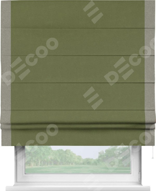 Римская штора производителя «Cortin», используется для проёма, пошита из ткани лён блэкаут оливковый, артикул 69516. Отделка шторы кантом «Стрим Дуо», ткань для канта используется из льна разной расцветки на выбор. Имеет универсальный механизм и подходит для монтажа: на потолок, на стену и в нишу.